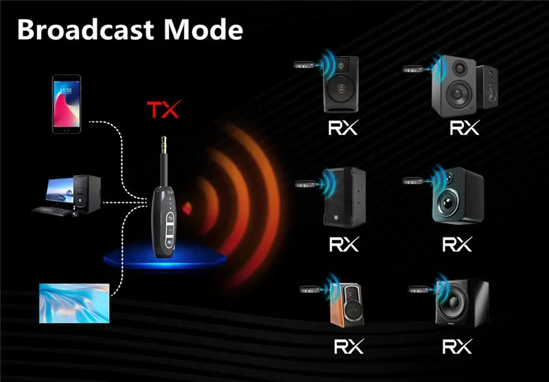 Coopere con dispositivos de salida de audio para enviar sonido de forma inalámbrica a receptores de transmisión (la función de transmisión RX de este dispositivo), que puede conectar varios receptores de transmisión simultáneamente;