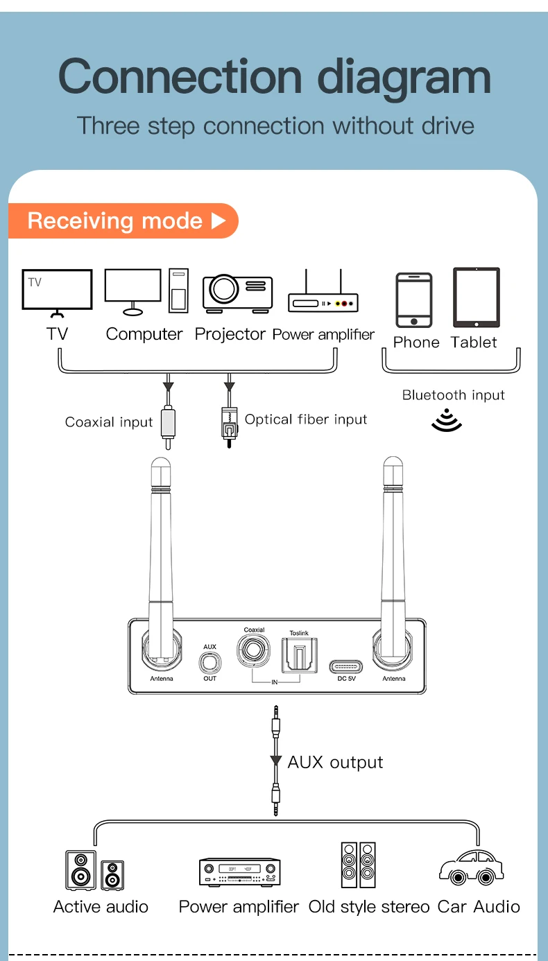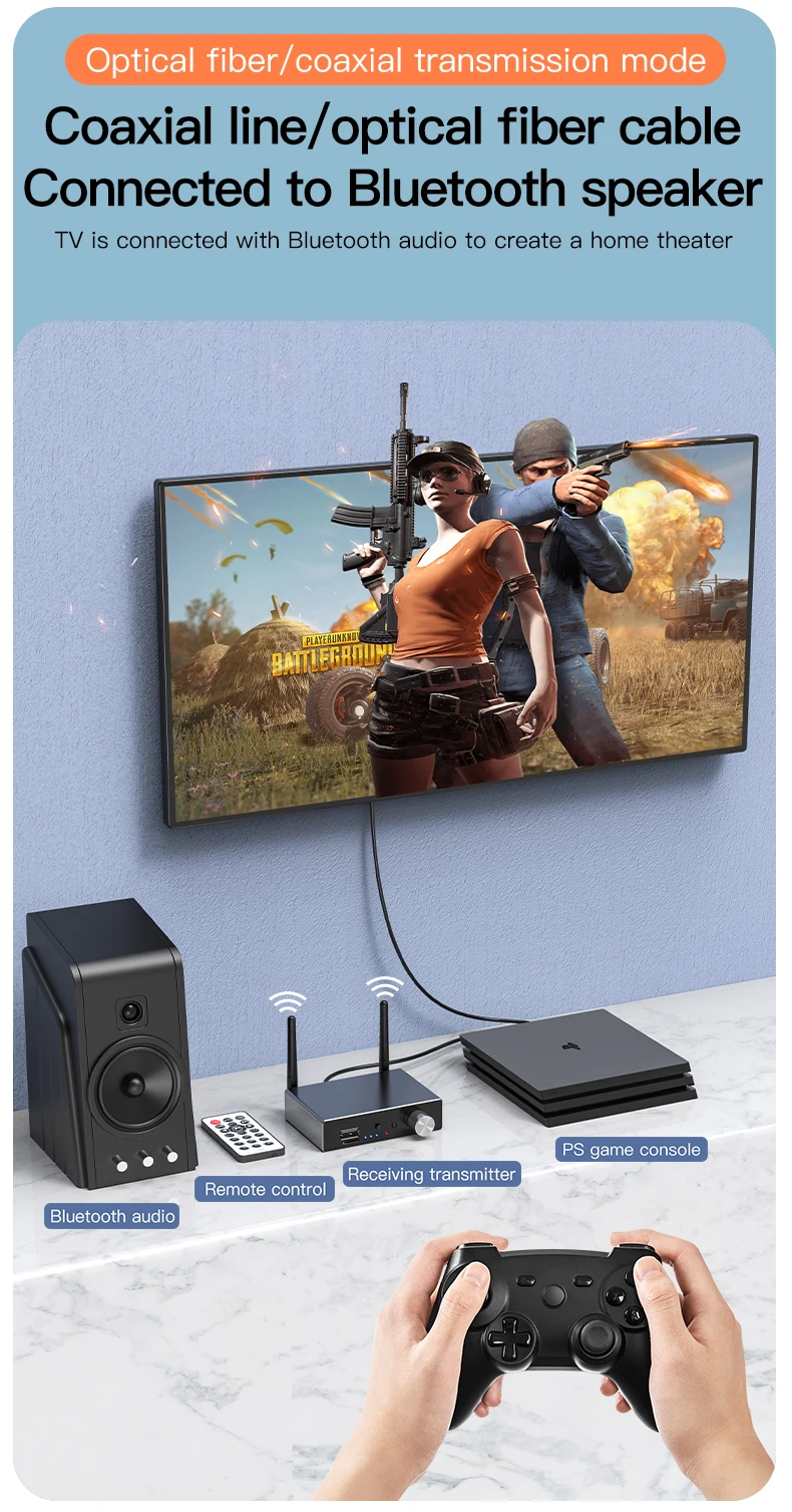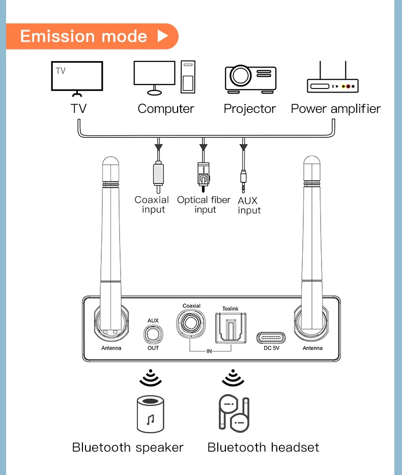 10. Modo transmisor para: TV/PC/proyector/amplificador de potencia/caja de TV/auriculares Bluetooth/auriculares/altavoz Bluetooth, etc.