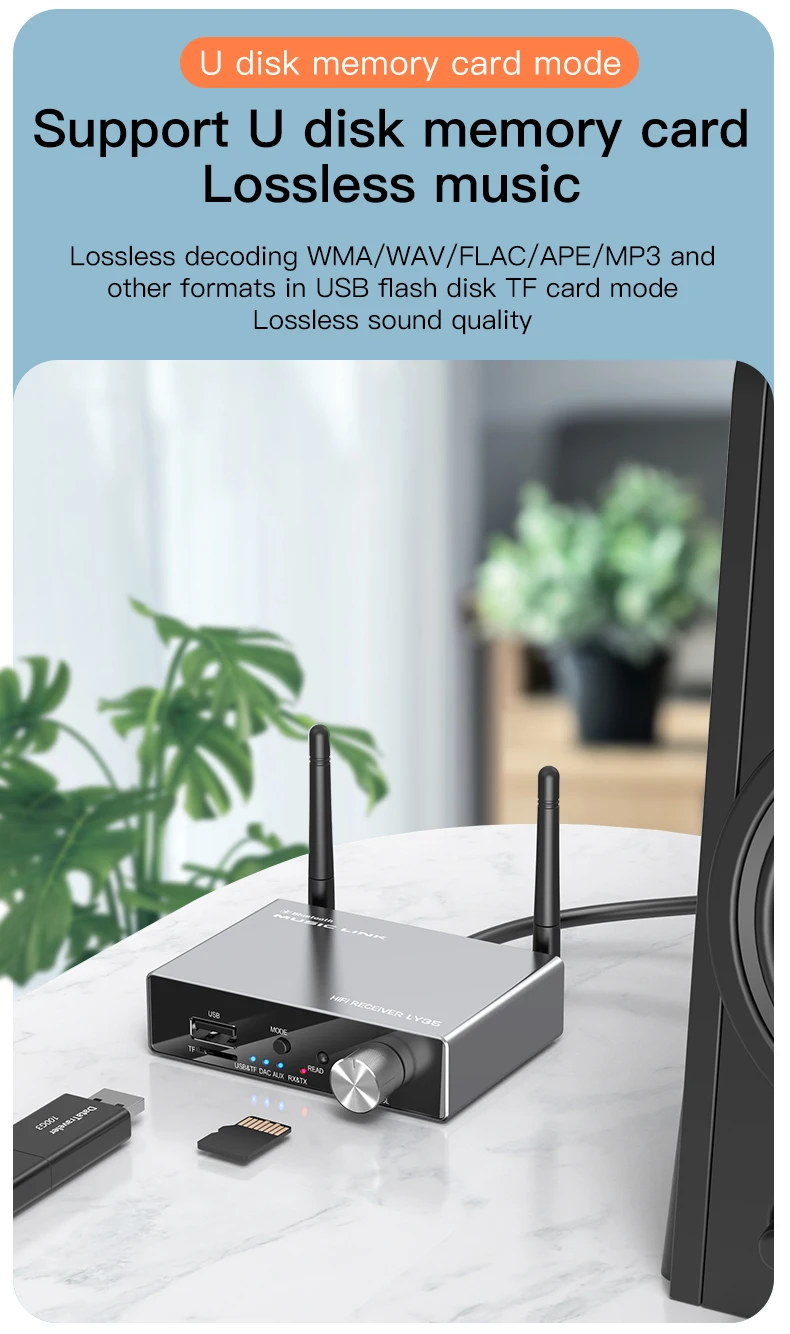 5. Reproducción TF de tarjeta, sin necesidad de controlador, plug and play, compatible con formato de música MP3/APE/FLAC/WAV/WMA.