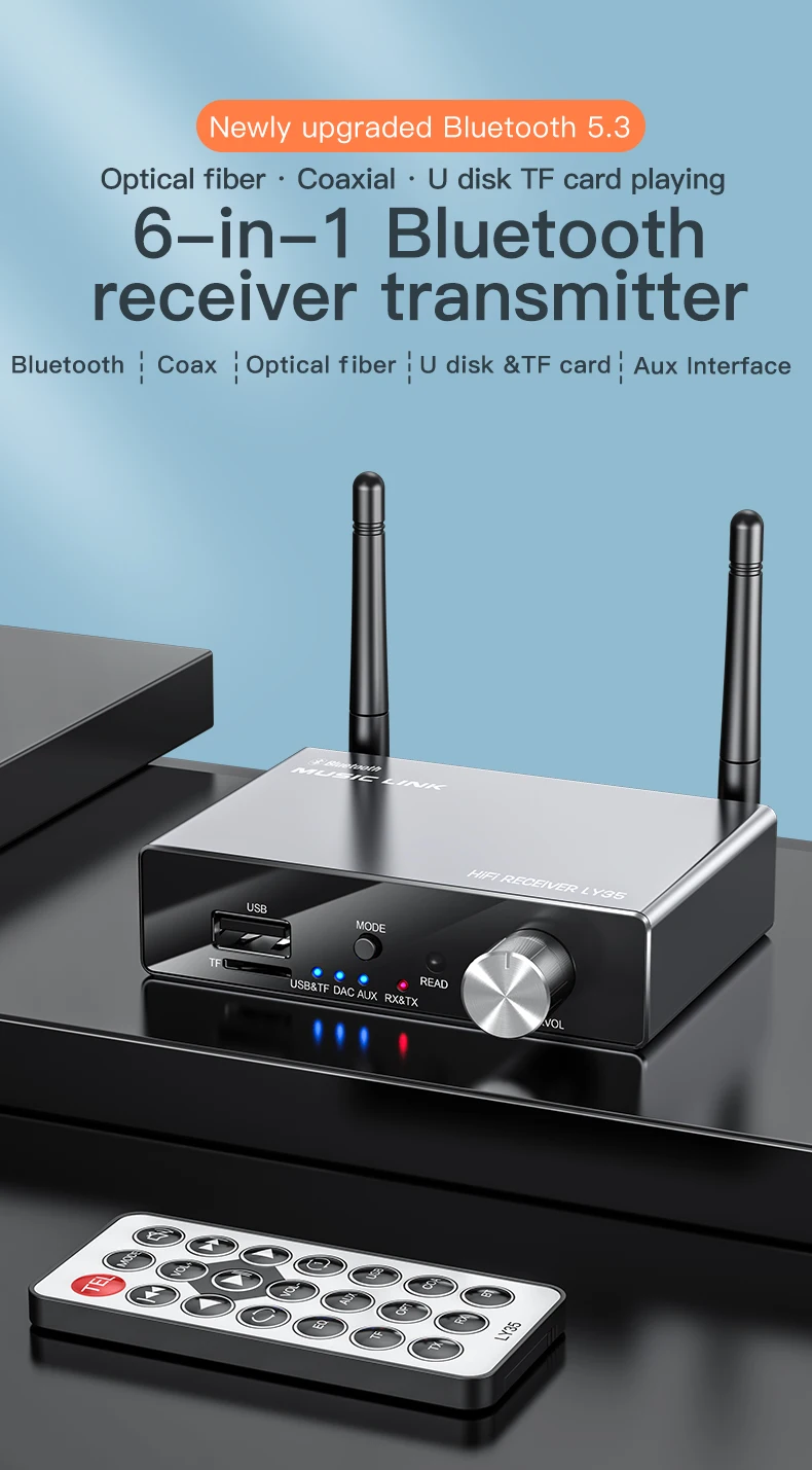 Comprar Transmisor receptor Bluetooth 5,3 DAC 6 en 1, óptico Coaxial, AUX, RCA, USB, TF, adaptador de Audio inalámbrico, convertidor Digital a analógico
