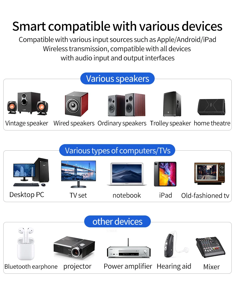 Dispositivos compatibles: teléfonos móviles y PAD Android, IOS, parlantes activos, amplificadores y parlantes o auriculares Bluetooth compatibles con el protocolo A2DP/.