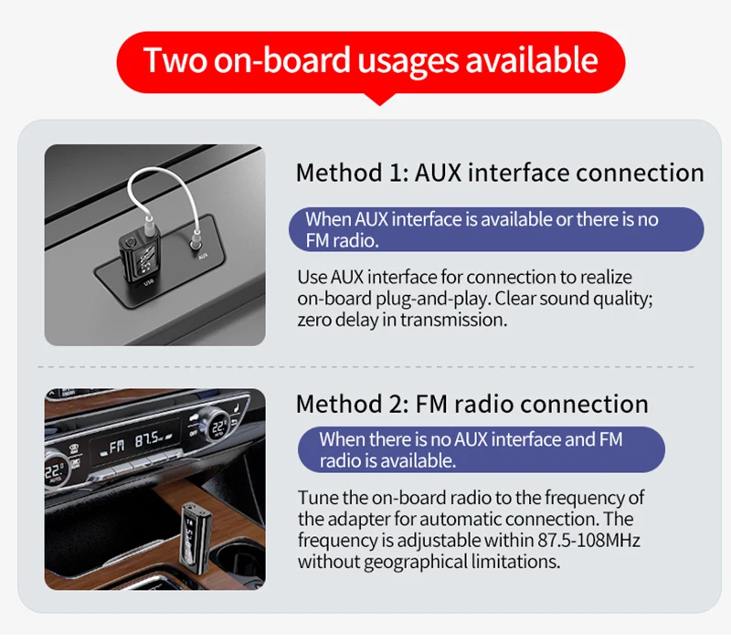 * La función de transmisión FM se utiliza para [actualizar] el audio del automóvil io a un altavoz Bluetooth, para lograr la escucha inalámbrica de música, navegación y llamadas telefónicas, y la frecuencia es ajustable.