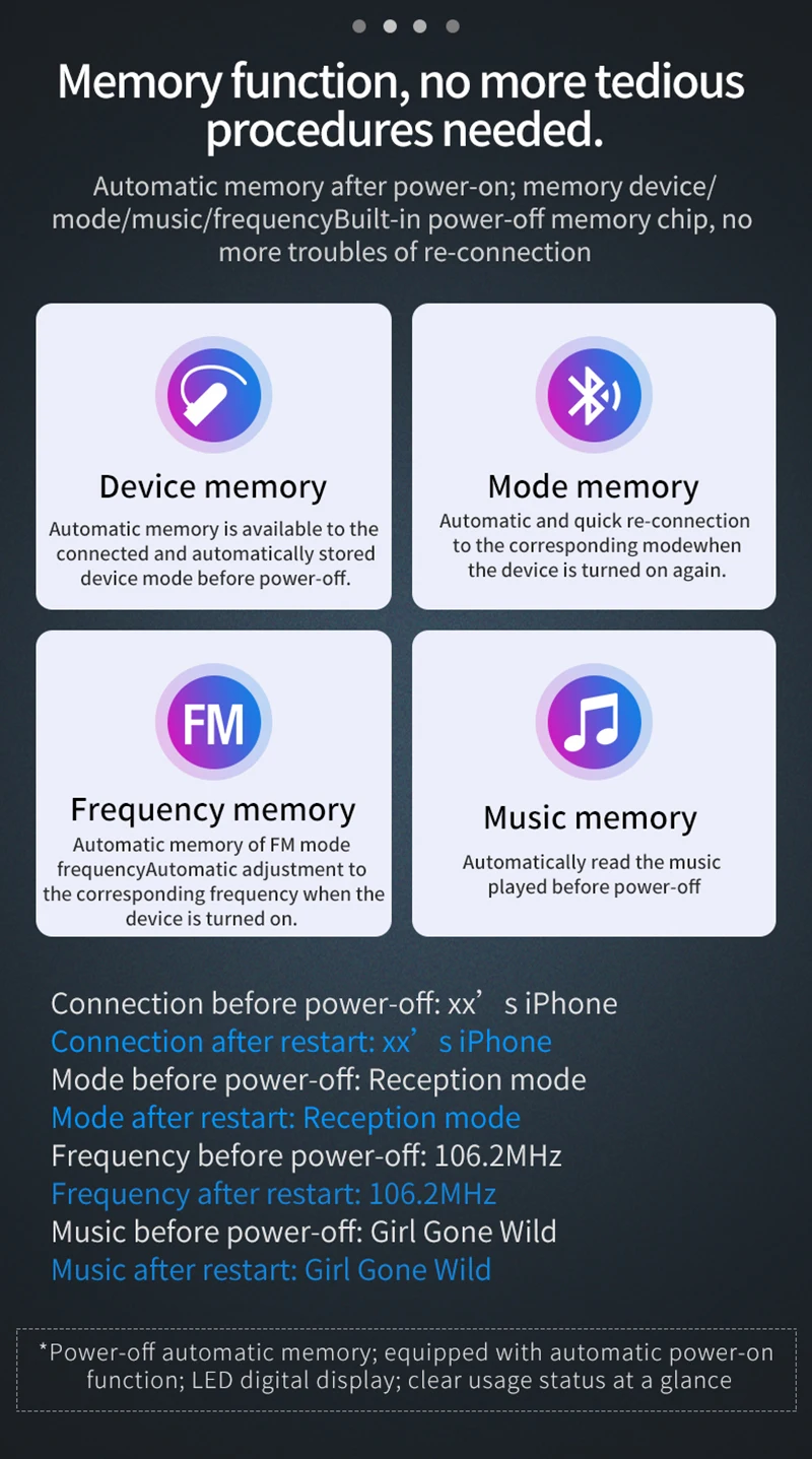 4. Transmisión FM, frecuencia ajustable (87,5 ~ 108MHZ), señal estable, sin ruido ni interferencias;