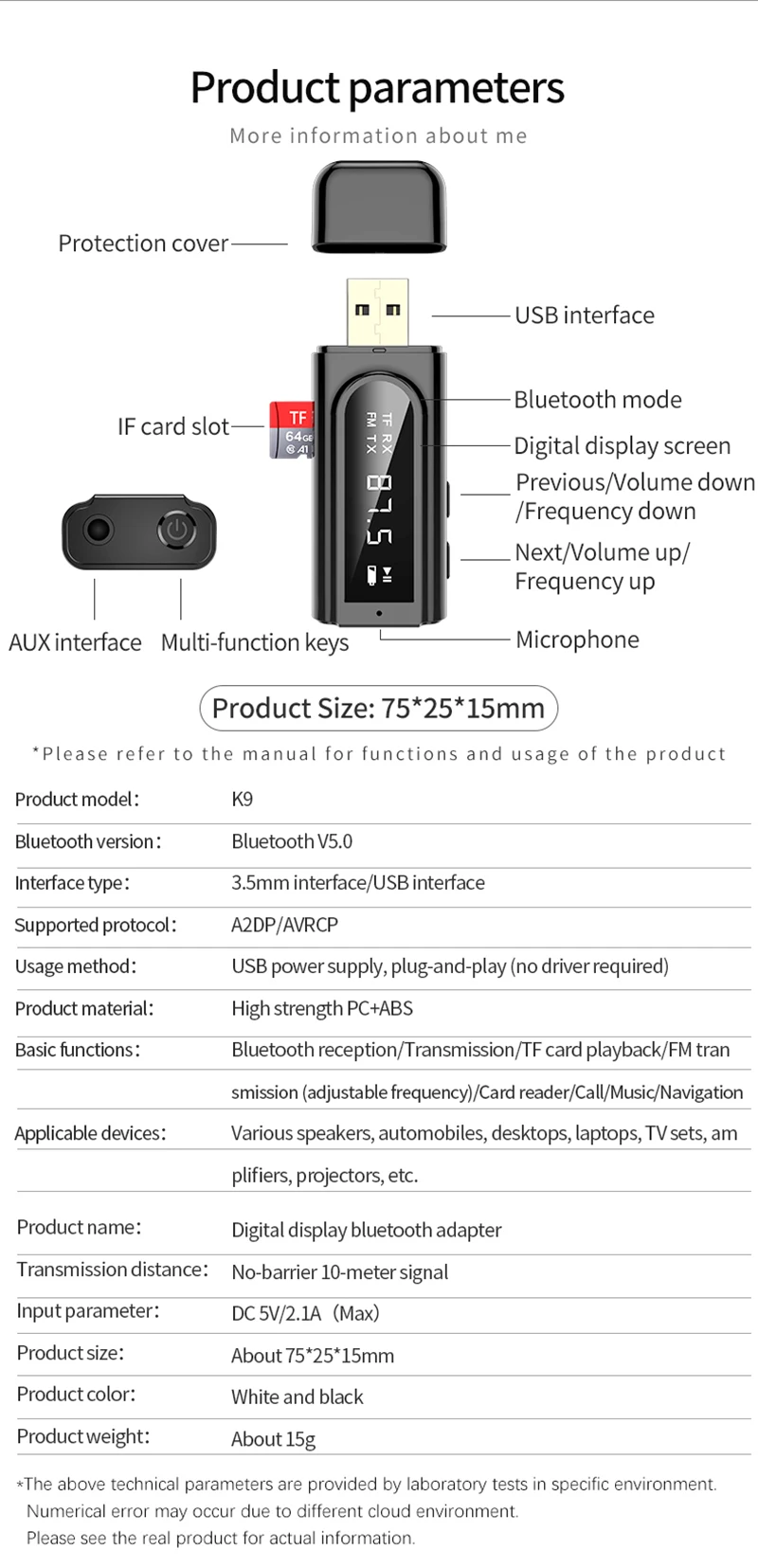 2. Funciones principales: receptor Bluetooth, transmisor Bluetooth, transmisor FM, reproducción de tarjetas TF, lector de tarjetas, tarjeta de sonido externa;