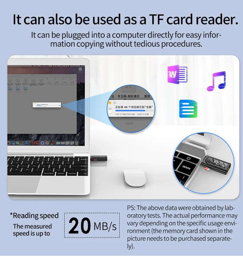 5. Función de lector de tarjetas TF, puede copiar datos y otras operaciones en el ordenador, está disponible la lectura y reproducción de música sin pérdidas en formato FLAC/WAV/MP3/AP E en la tarjeta TF.