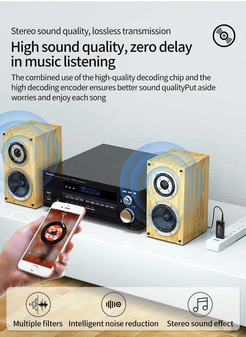 * Modo de transmisor TX para: TV/PC/proyector/amplificador de potencia/caja de TV/auriculares Bluetooth/auriculares/altavoz Bluetooth, etc.