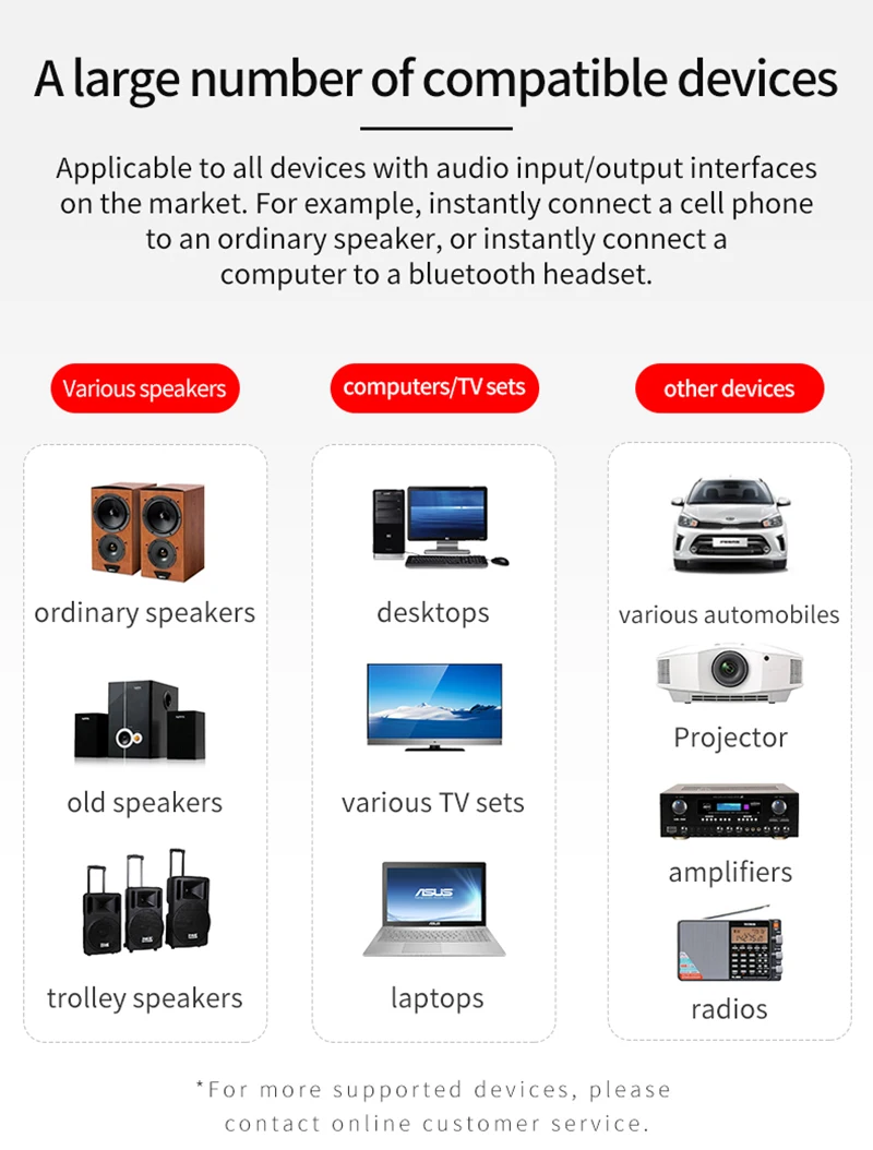 (Nota: Es solo un receptor de transmisor de audio Bluetooth multifunción VAORLO. Solo se puede usar para la transmisión de audio, por lo que no puede usarlo para su teclado, mouse, transferencia de archivos).