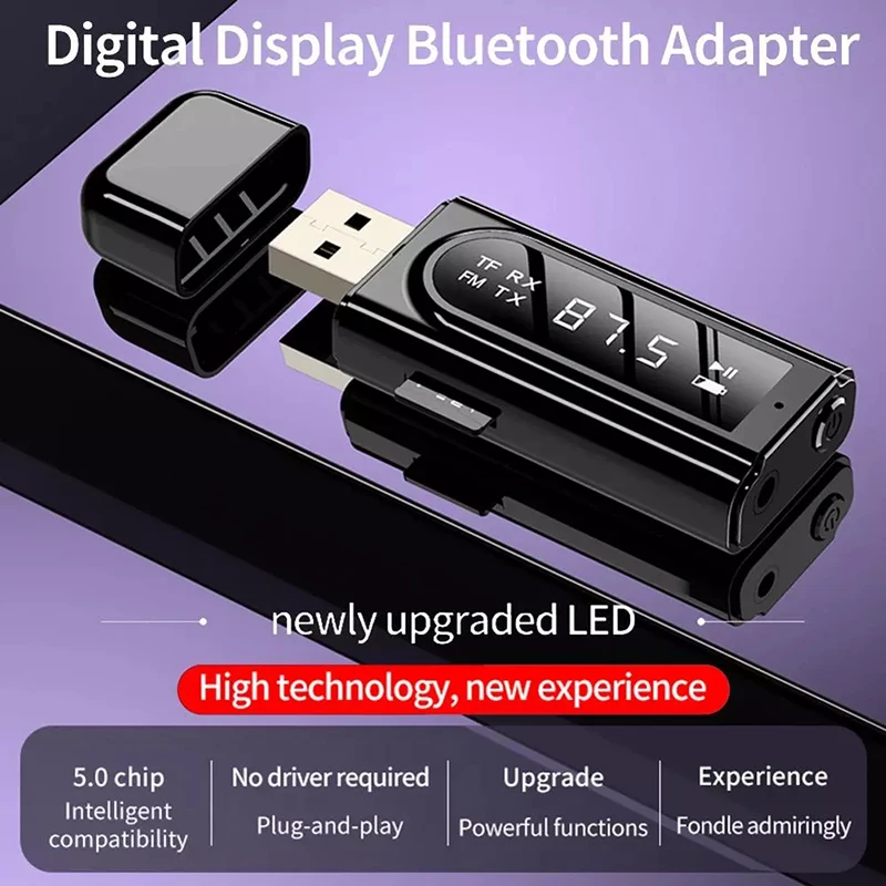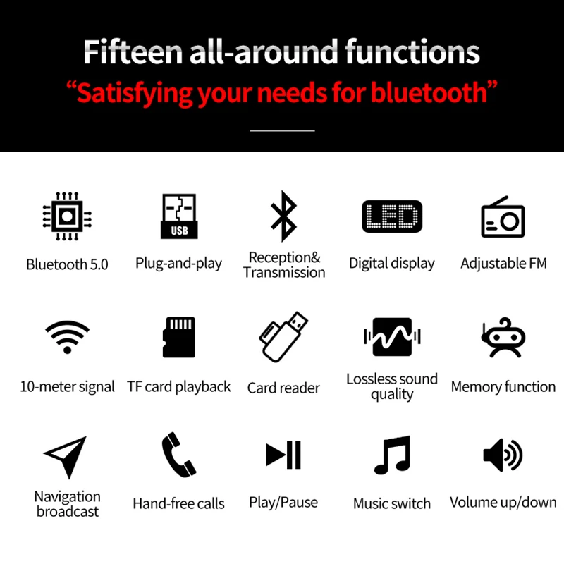 * Este producto integra las funciones de recepción Bluetooth, transmisión Bluetooth, reproducción de tarjetas TF, pantalla digital LED en línea USB, transmisión FM (ajuste de frecuencia) y control de teclas en uno.