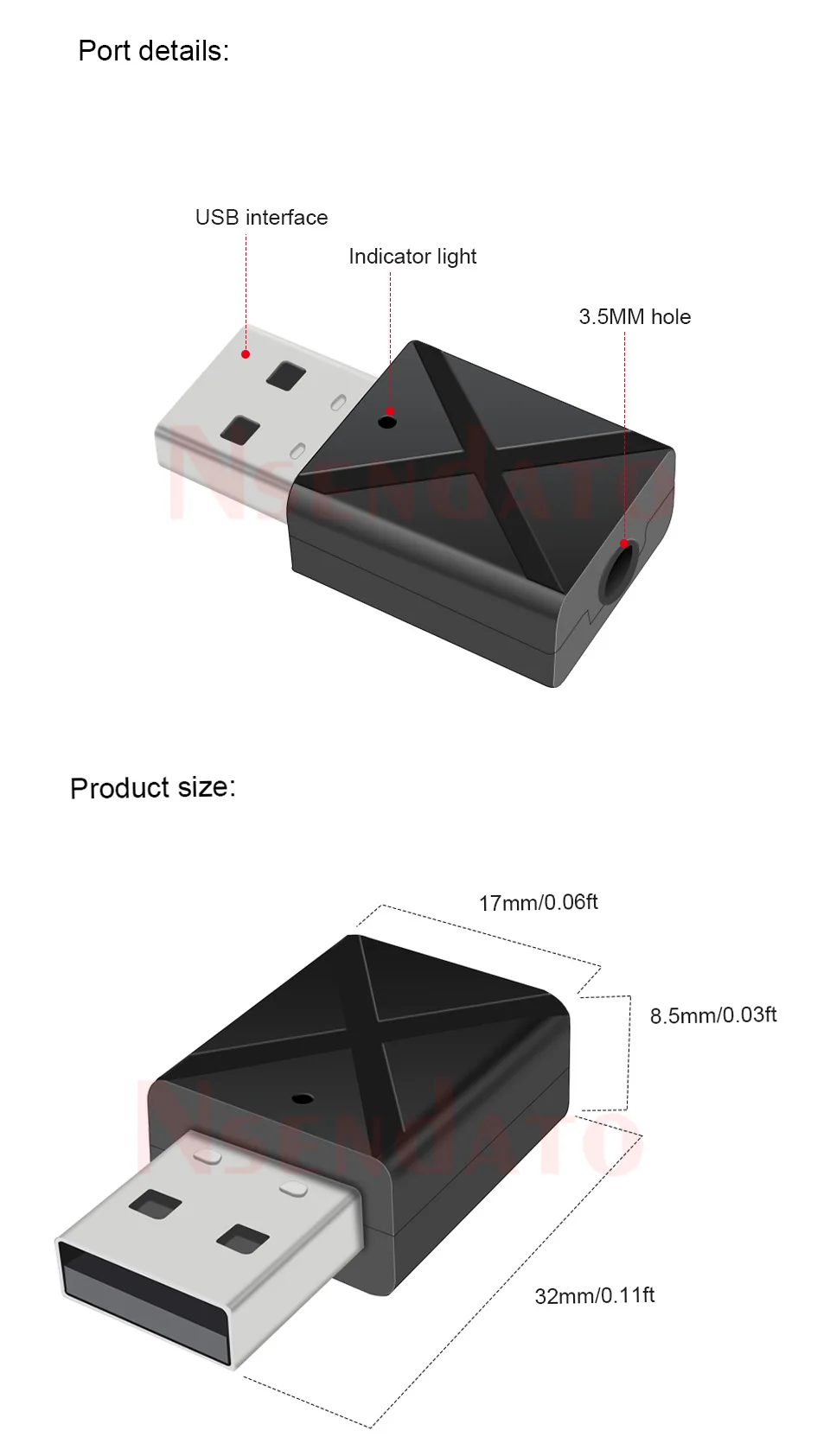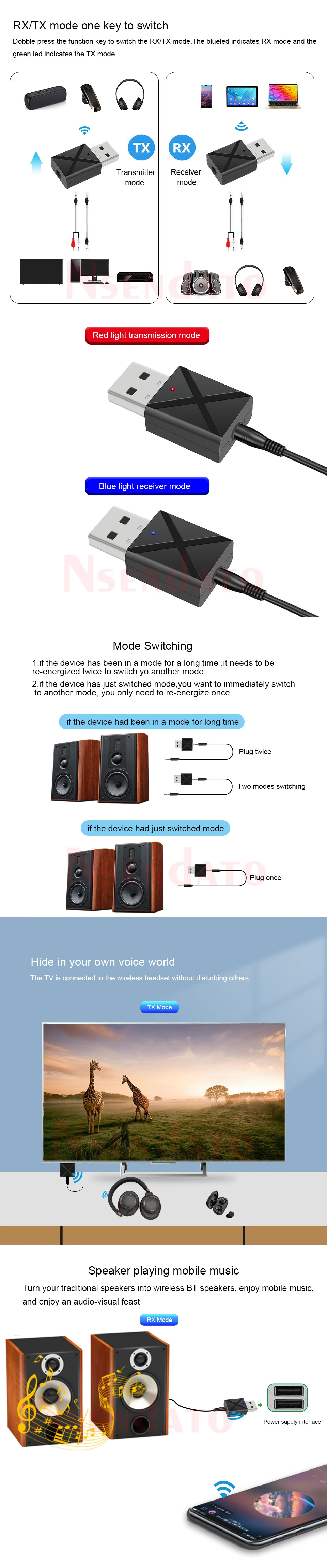 EspecificacionesTecnologías: BT5.0, A2DP, AVRCP (solo modo receptor)Rango de operación: Hasta 10 m / 33 pies (sin ningún objeto que bloquee)Nombre de emparejamiento (modo receptor): KN320Modo transmisor Nsendato: la luz LED roja está encendidaModo receptor Nsendato: la luz LED azul está encendidaPaquete1x adaptador de transmisor/receptor de audio Bluetooth 5.01 cable auxiliar de 3,5 mm.1x Manual de usuarioNotas1.Este transmisor y receptor de audio inalámbrico Nsendato extremadamente portátil y liviano es una solución de audio inalámbrica ideal para una amplia gama de situaciones y usos.2. Modo transmisor: transmite audio de forma inalámbrica desde su televisor, sistema estéreo doméstico o reproductor de CD sin Bluetooth a sus auriculares o parlantes Bluetooth3.Modo receptor: Nsendato transmite audio de forma inalámbrica desde su teléfono, tableta o computadora con Bluetooth a su estéreo, parlantes o auriculares con cable4.Cambio de modo:a) Si el dispositivo ha estado en un modo durante mucho tiempo, es necesario volver a energizarlo dos veces para cambiar a otro modo.b) Si el dispositivo acaba de cambiar de modo, desea cambiar inmediatamente a otro modo, solo necesita volver a energizarlo una vez.5.Método de emparejamientoa) Modo RX: Nombre de emparejamiento: KN320, busque KN320 en la configuración de Bluetooth del teléfono para emparejar.La luz azul parpadea durante el proceso de emparejamiento y deja de parpadear después de que el emparejamiento se haya realizado correctamente.Conecte el producto al dispositivo de audio con un cable de audio 3.5.b) Modo TX: el modo TX buscará automáticamente otros dispositivos receptores Bluetooth (como auriculares Bluetooth, altavoces Bluetooth, receptores Bluetooth, etc.), la luz roja parpadea durante el emparejamiento y la luz roja deja de parpadear después de que el emparejamiento se realice correctamente.Conecte el producto a un dispositivo como un televisor con un cable de audio 3,5/cable de audio RCA.6.El KN320 tiene solo 32 mm (1,26 '') de ancho y pesa solo 3,2 g (0,11 oz), pero tiene potentes capacidades de transmisión de audio inalámbrica.Desliza el transmisor y el receptor Nsendato en tu mochila o bolso para computadora portátil y llévalo contigo sin el menor esfuerzo.7. Amplia compatibilidad: con el cable de 3,5 mm incluido, este adaptador receptor y transmisor se puede utilizar ampliamente en su computadora, computadora portátil, sistema estéreo doméstico, auriculares, teléfono inteligente, reproductor de MP3, reproductor de CD, etc.
