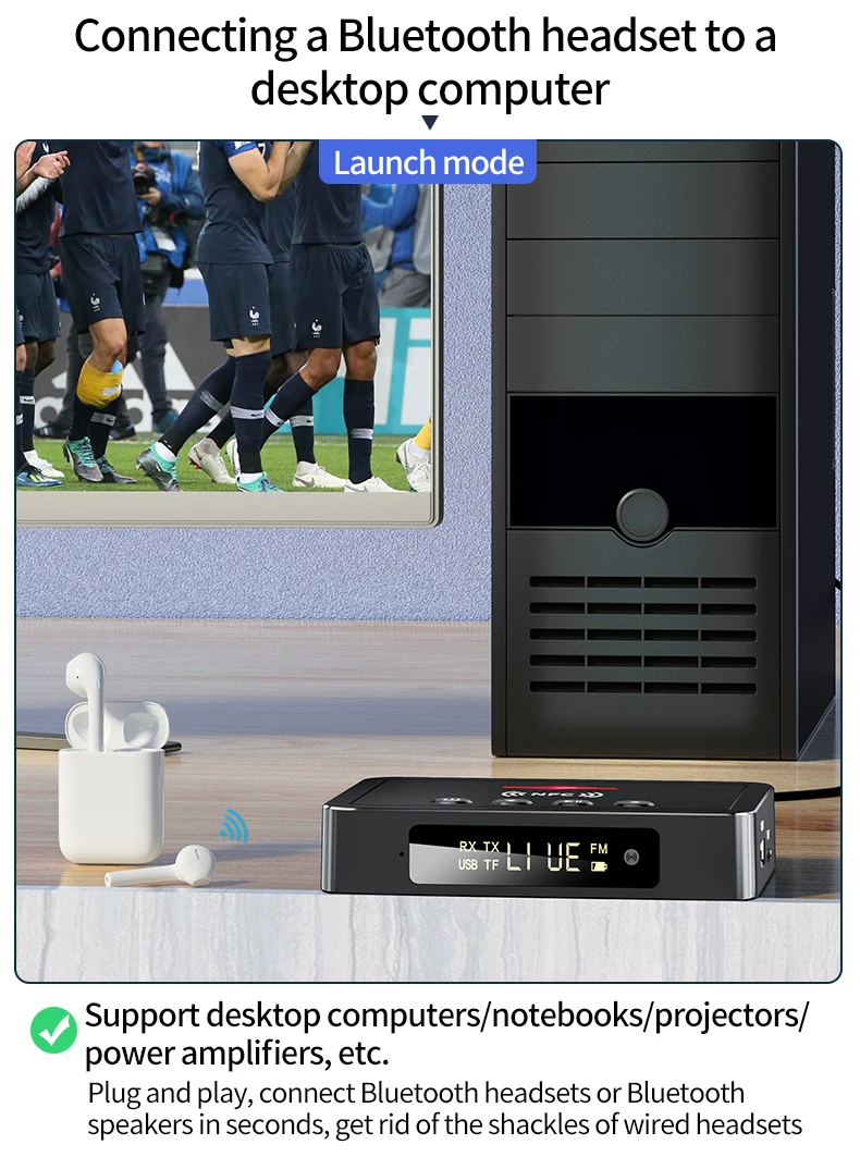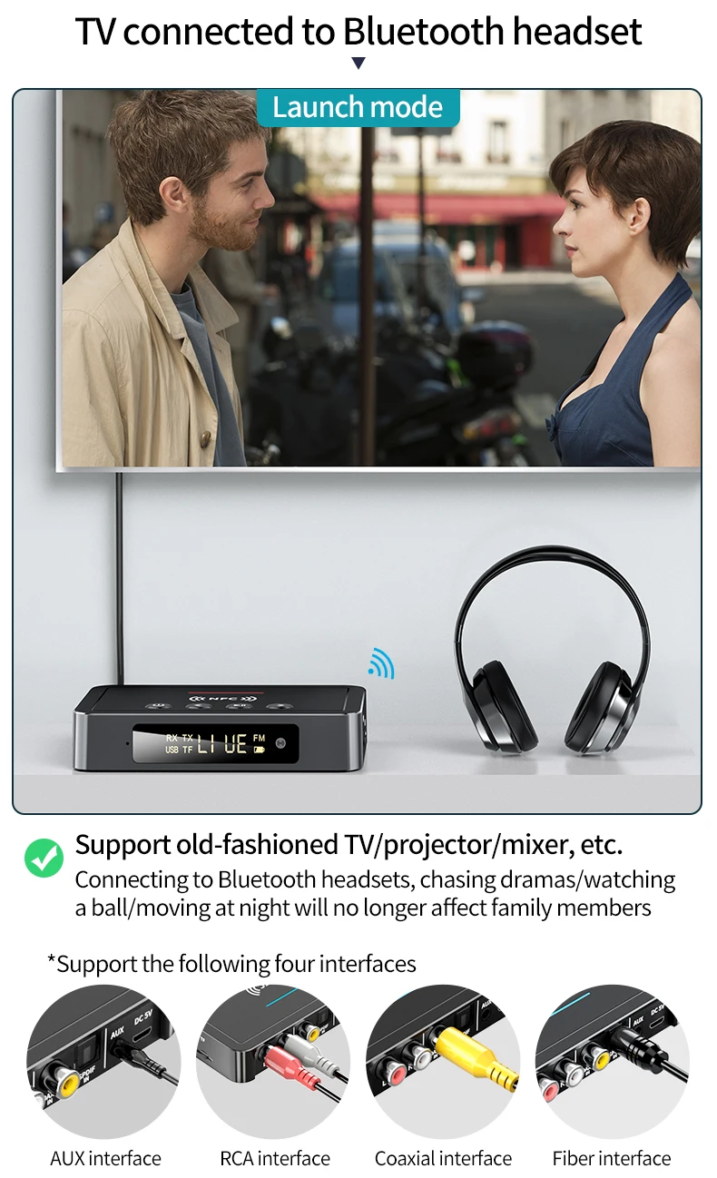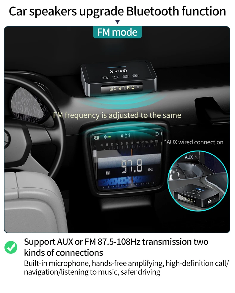 ◆Recepción compatible con Bluetooth (RX), transmisión compatible con Bluetooth (TX), diseño tres en uno de transmisión FM.