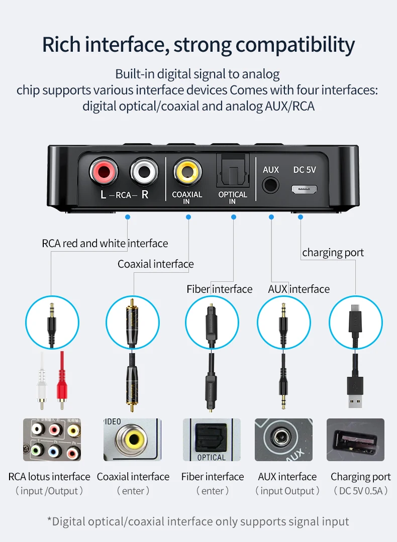 ◆ Chip digital a analógico incorporado, compatible con fibra óptica digital, coaxial, AUX, interfaz RCA.