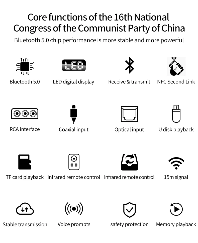 17.Funciones básicas: recepción compatible con Bluetooth, lanzamiento compatible con Bluetooth, reproducción de disco U, reproducción de tarjeta tfcard, control remoto por infrarrojos, operación de tecla, entrada de fibra digital/coaxial, NFC