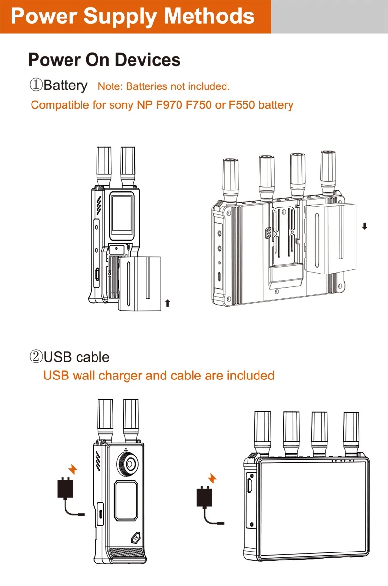 2.Compatible con batería Sony NP F970/F750/F550, la batería no está incluida.