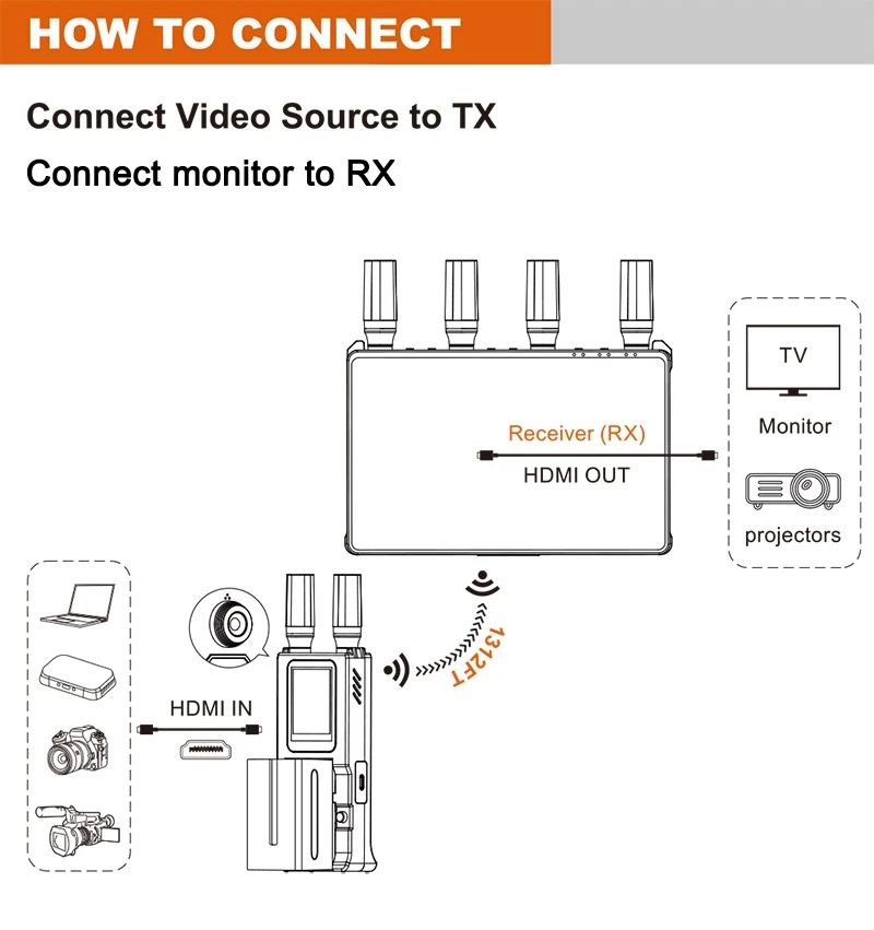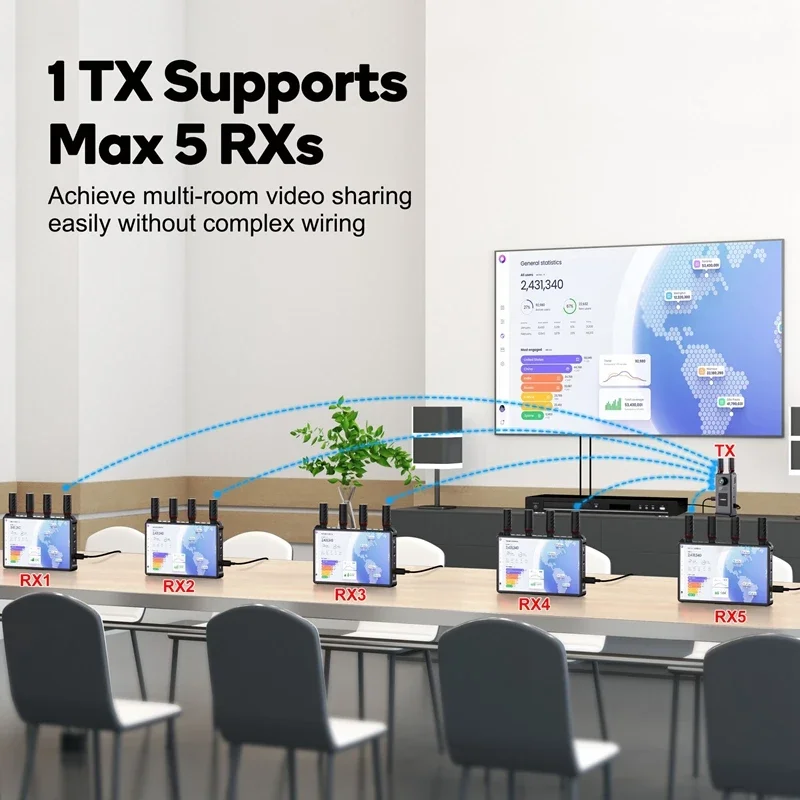 Resolución Full HD de 1080P con un alcance inalámbrico de 400 metros (1.312 pies).Admite transmisión "1TX-a-5RX",