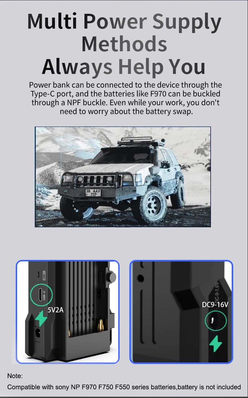 1.Modo 1 a 1, en un espacio abierto sin barreras, la distancia de transmisión puede ser de hasta 200 metros; 1 TX puede funcionar con máx.4 RX al mismo tiempo. Con el aumento de RX o barreras, la distancia de transmisión se acortará en consecuencia. Le recomendamos que utilice este producto en un espacio libre de barreras, la distancia final estará sujeta al uso real. 2.El monitoreo de la aplicación está relacionado con la capacidad de recepción de su teléfono móvil, le recomendamos usarlo dentro de los 30 m. 3. Compatible con batería sony NP F970 F750 F550, La batería no está incluida.