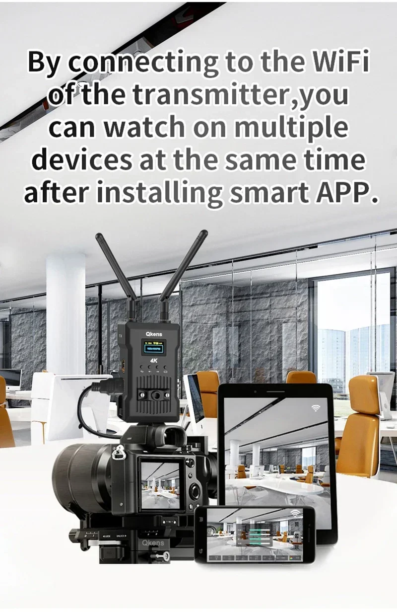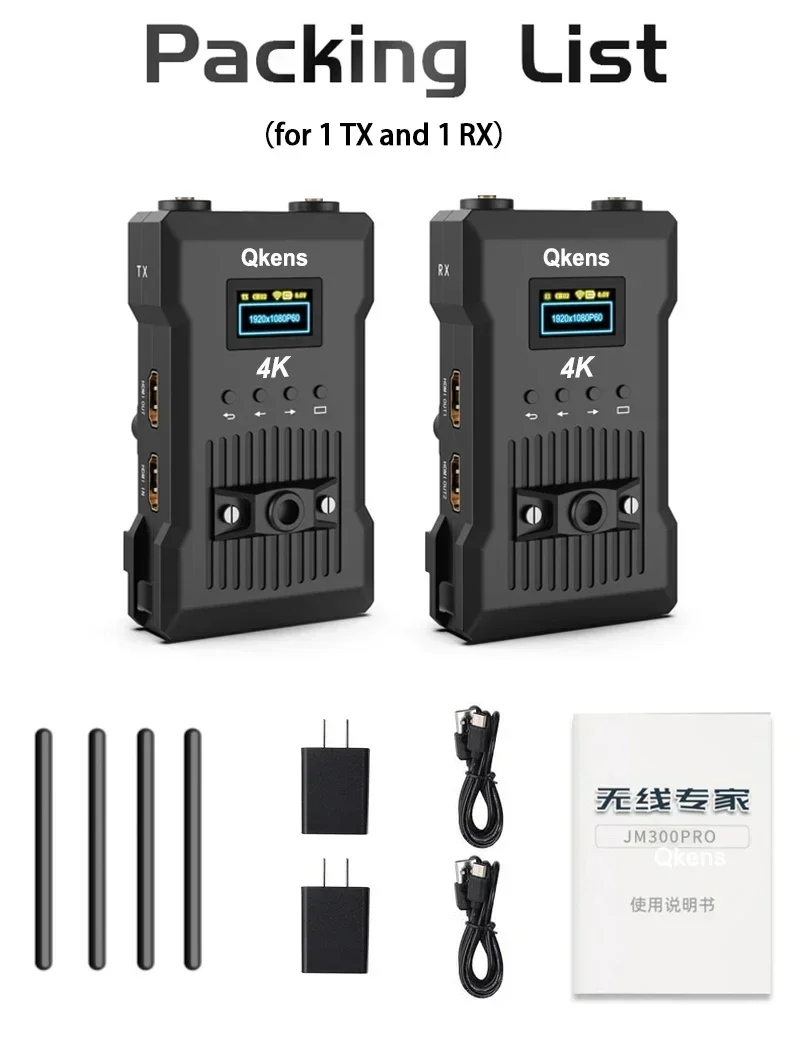 Transmisor inalámbrico Qkens 4K x 1 Receptor inalámbrico Qkens 4K x 1 Antena x 4 Adaptador de corriente de 5 V 2 A x 2 Cable de alimentación USB x2 Manual de usuario x 1