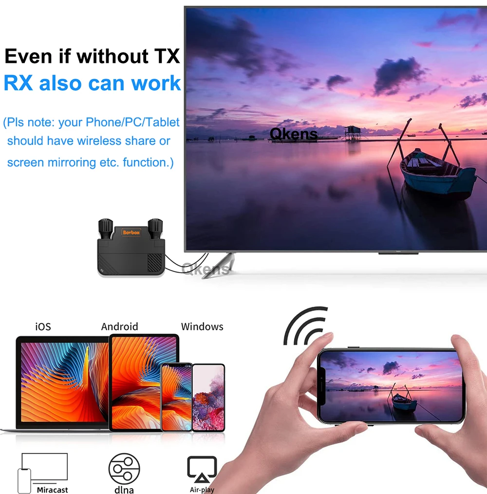 * Atención: 1.Utilice este producto en un espacio libre de barreras, no pase por ninguna barrera. Si tiene barrera, la distancia de extensión depende del entorno específico. 2.El TX no puede funcionar solo, tiene que funcionar con RX, 1 RX puede funcionar con máx.8 TX. 3.El RX puede funcionar solo, pero su PC o teléfono debe tener función inalámbrica de compartir o duplicar la pantalla.
