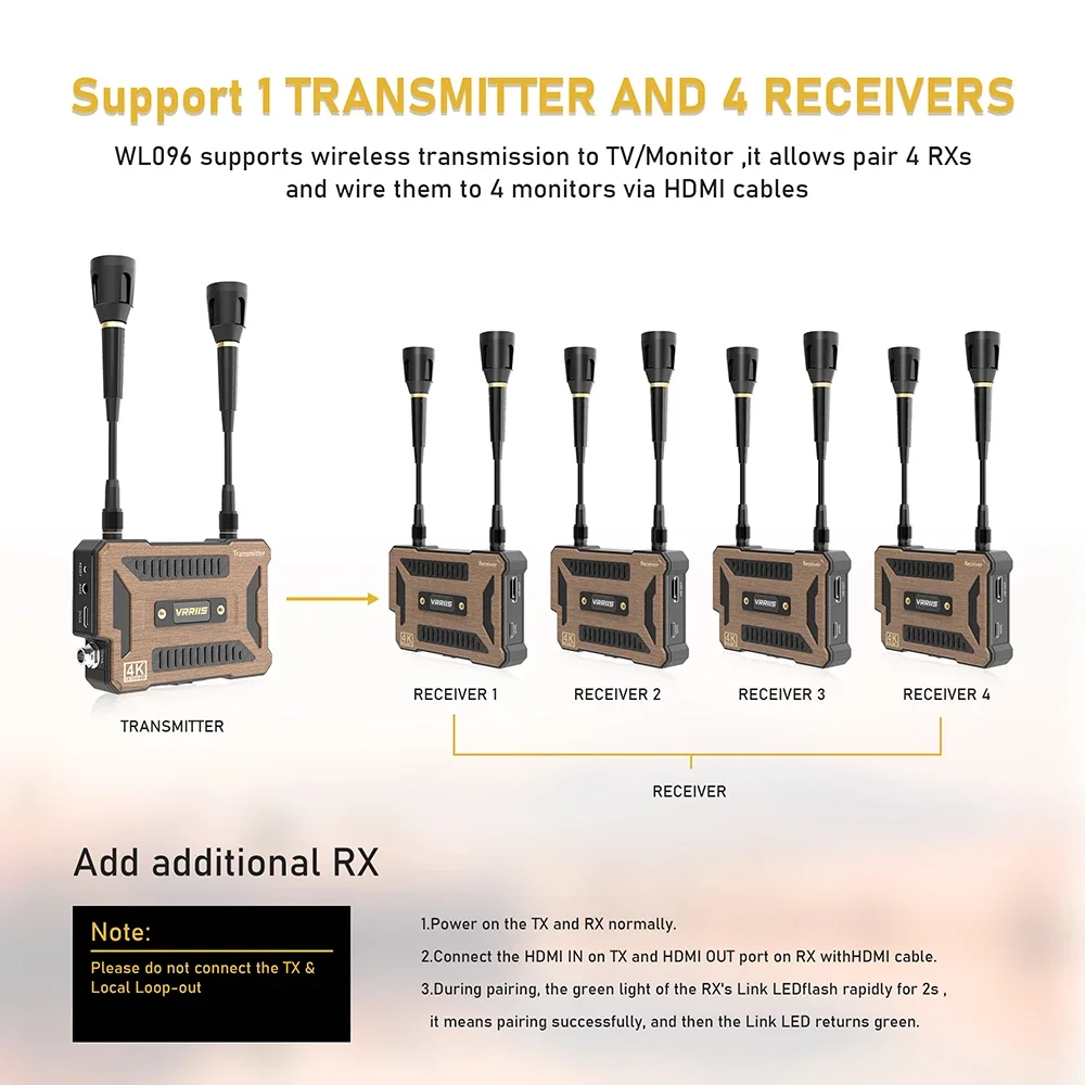 Compatible con 1TX a 4RXs: admite 1 transmisor para conectar 4 receptores, adecuado para varios escenarios.