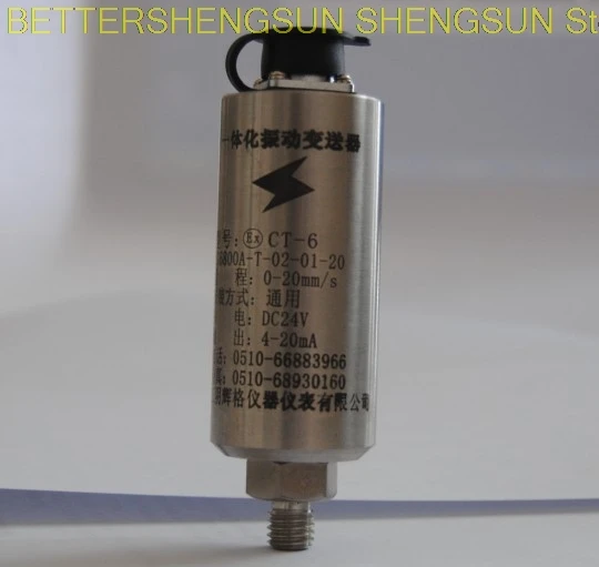 Parámetros técnicos Respuesta de frecuencia 2,1: 10 ~ 1000Hz * o 5 ~ 1000Hz (nota especial) Frecuencia natural 2,2: 10Hz Rango de medición 2,3: desplazamiento 0-1000um (opcional) Velocidad 0-20 MM/S (opcional) 0-100 mm/s * 2,4 corriente de salida: 4 ~ 20mA Impedancia de salida: 2,5 ohmios=500 Voltaje de funcionamiento 2,6: 10% 2,7 forma de cableado: sistema de segunda línea Dirección de medición 2,8: ver etiqueta del producto 2,9 El uso del medio ambiente: temperatura de-40 a 100 grados C humedad relativa es inferior a 90% Dimensiones 2,10: 35x75mm 2,11 roscas de montaje: M10 x 1,5x15mm (profundidad) Peso 2,12: aproximadamente 300g 3 instalar Posición de instalación 3,1: Montaje vertical u horizontal en el punto de vibración medido, los tornillos inferiores del sensor M10 * 10*1,5 se fijan en la carcasa y luego se puede apretar el tornillo del sensor. Tamaño y especificación de la instalación 3,2: una imagen de referencia, si la posición de instalación del transmisor por erosión de vapor a alta temperatura. Con el fin de reducir el transmisor de temperatura ambiente y las medidas de protección, en circunstancias normales puede estar sin protección. 3,3 instrucciones de cableado: cable marrón DC24V lado de la fuente de alimentación, cable azul DC24V lado de la fuente de alimentación, mientras que el cable marrón y Azul también es el cable de salida de 4 ~ 20mA. El Cable de conexión requiere un buen rendimiento de aislamiento, utilizando un cable blindado de dos núcleos.