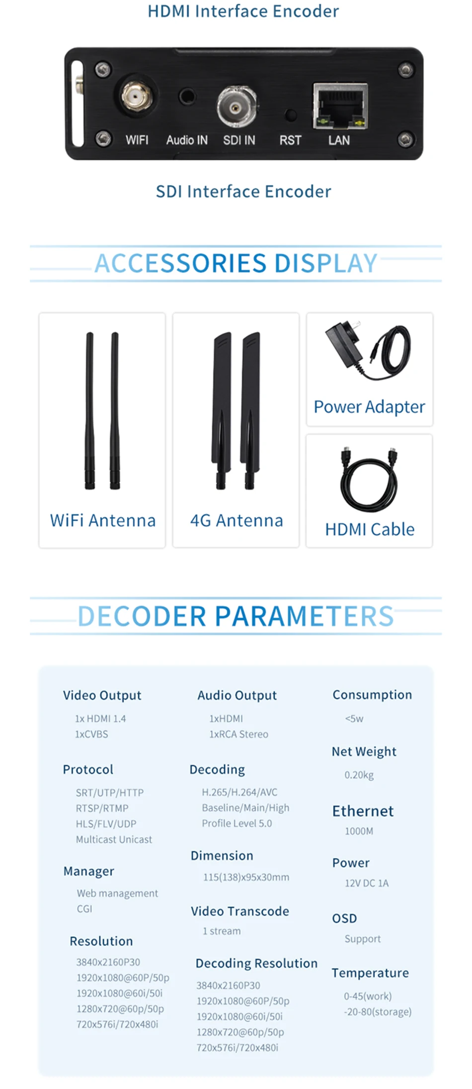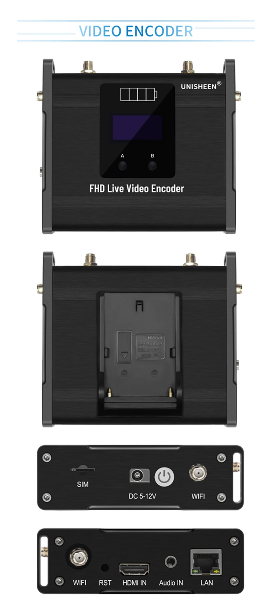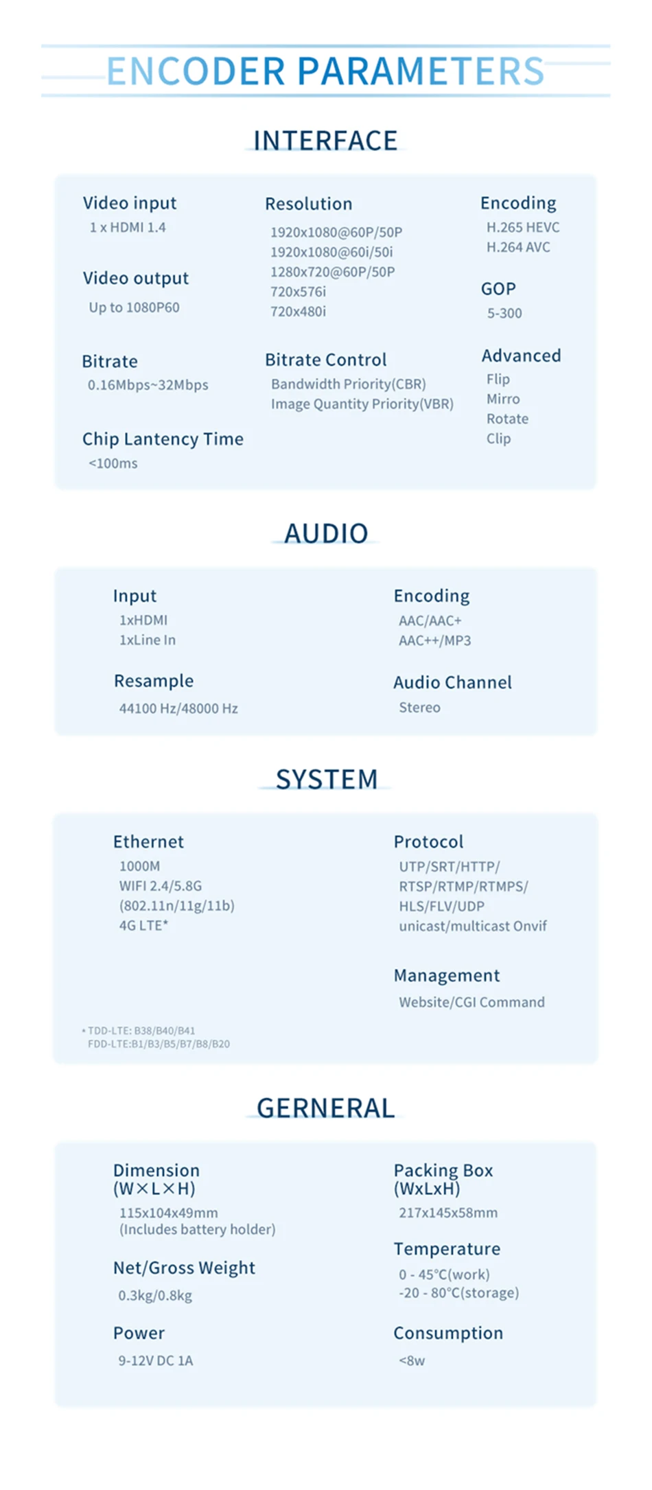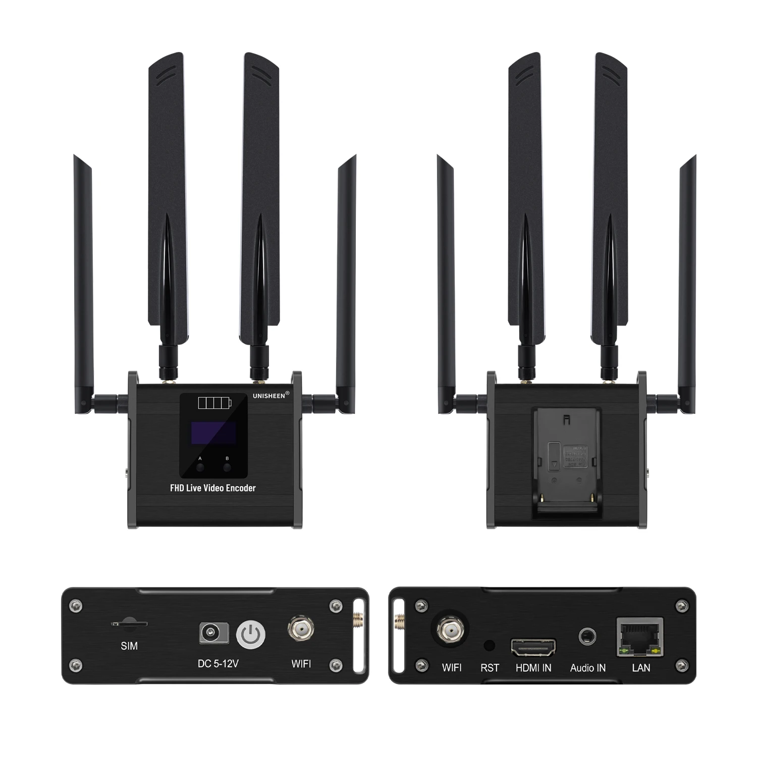 * Compatible con 4G/LTE * Compatible con batería * Compatible con una tecla para iniciar/detener transmisión * Compatible con protocolo RTMPS/SRT