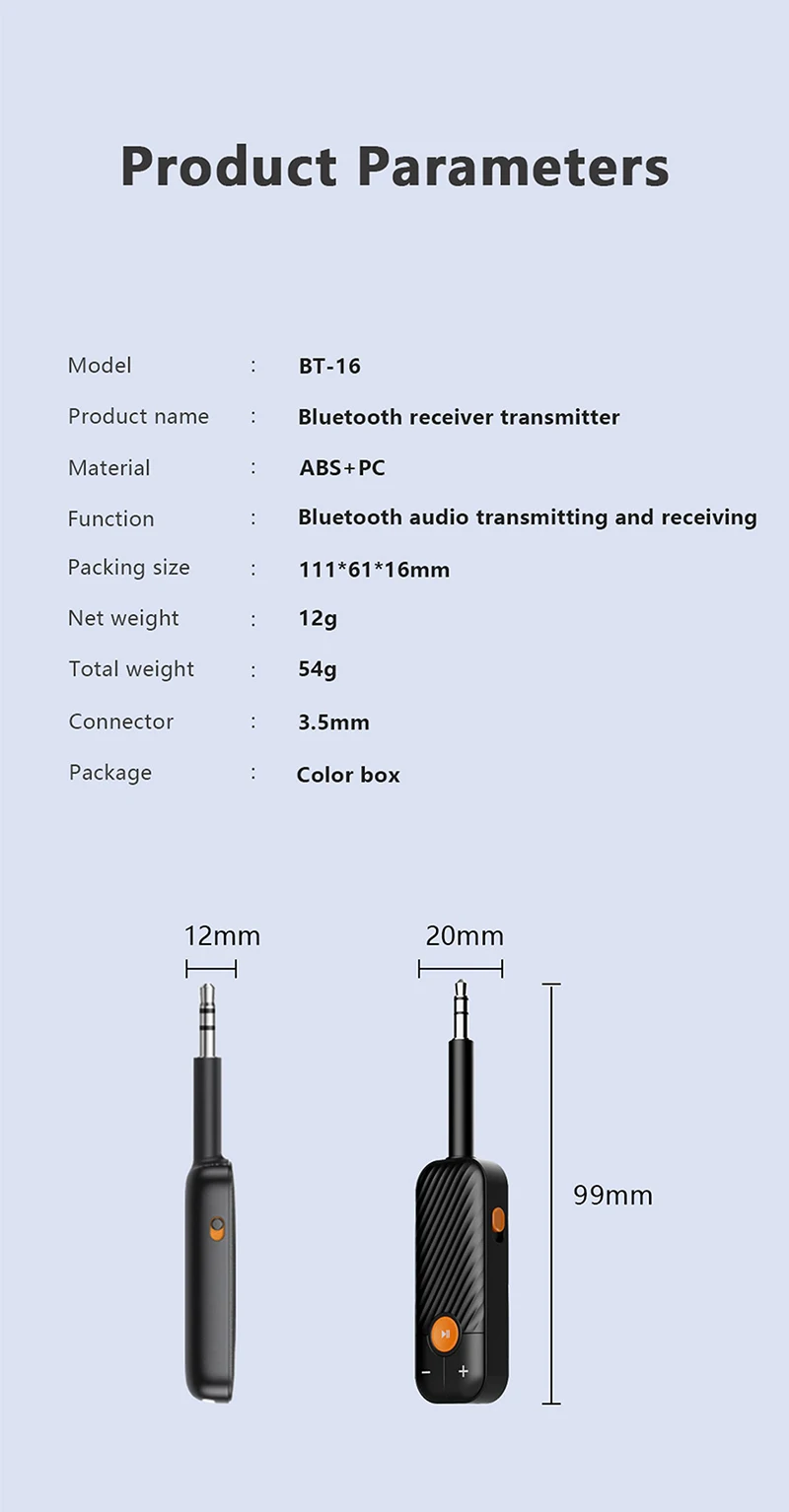 Product Model: BT16 2 IN 1 Bluetooth Audio Receiver Transmitter