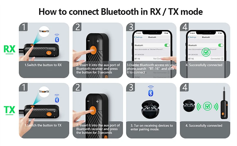 Bluetooth Receiver Mode (RX): Receive Bluetooth signal and transmit it to wired audio through Bluetooth connection.