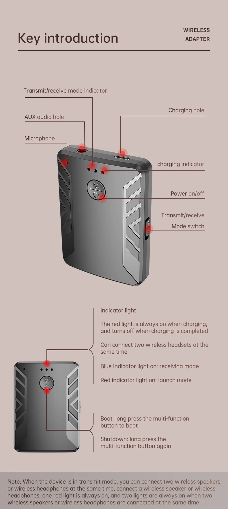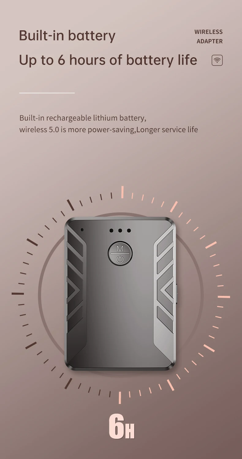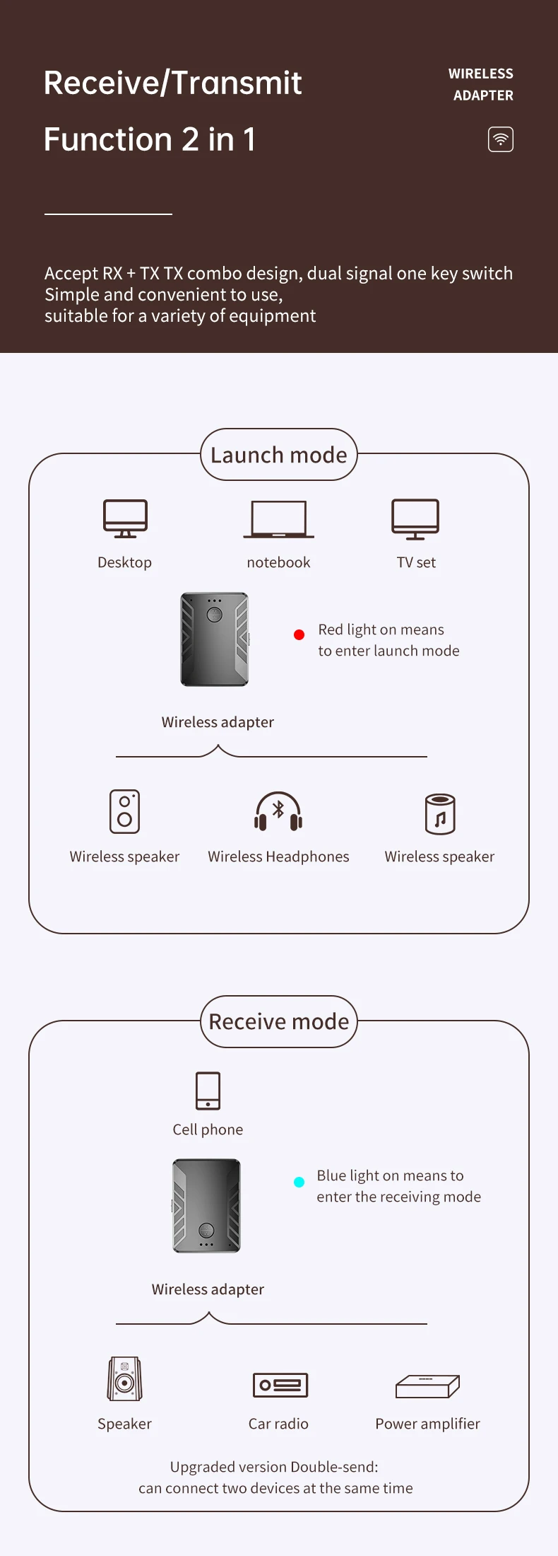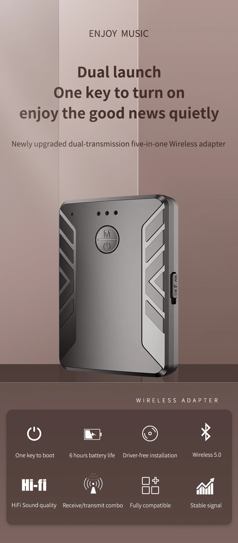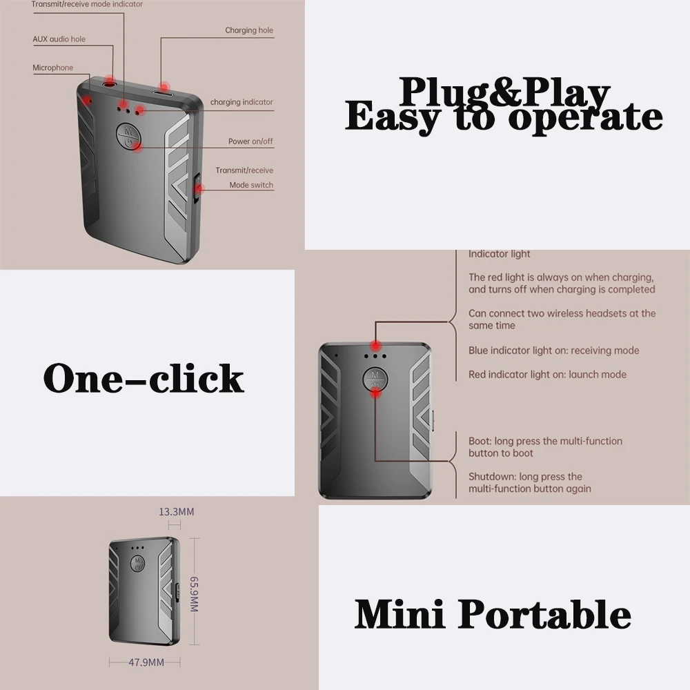 Función: receptor y transmisor Bluetooth 2 en 1Calidad de sonido HIFI con reducción de ruido incorporada;Distancia de la señal de transmisión: 15M;Totalmente compatible con emparejamiento automático;Modo transmisor: conecta dos dispositivos al mismo tiempoBatería de litio incorporada: 300mAhTiempo de trabajo: ≤ 6HInterfaz de entrada: 3,5mm;Voltaje de entrada: CC/5V;