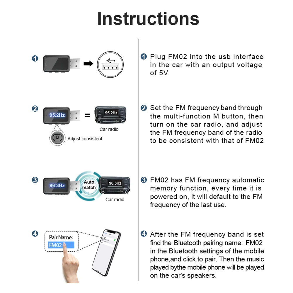 2. [de usar Fácil] La banda de frecuencia predeterminada es de 95,0 MHz, que se puede usar directamente. Si el ruido de reproducción es alto, se pueden ajustar otras bandas de frecuencia en cualquier momento.