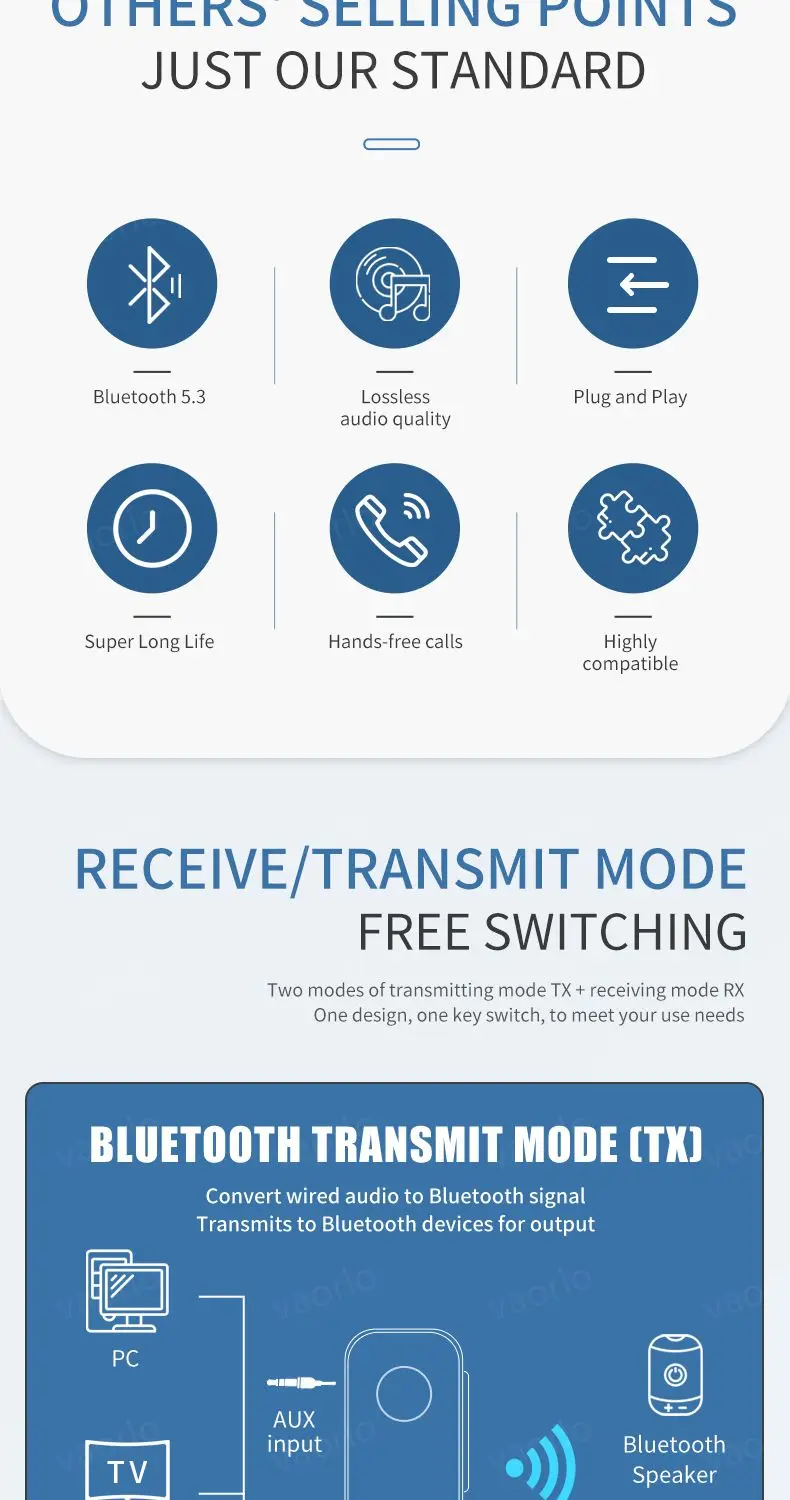 • Música estéreo y llamada Hansfree: con este adaptador, puede disfrutar de música estéreo de alta calidad y hacer llamadas manos libres sin necesidad de cables.(Solo el modo receptor RX admite llamadas de micrófono)