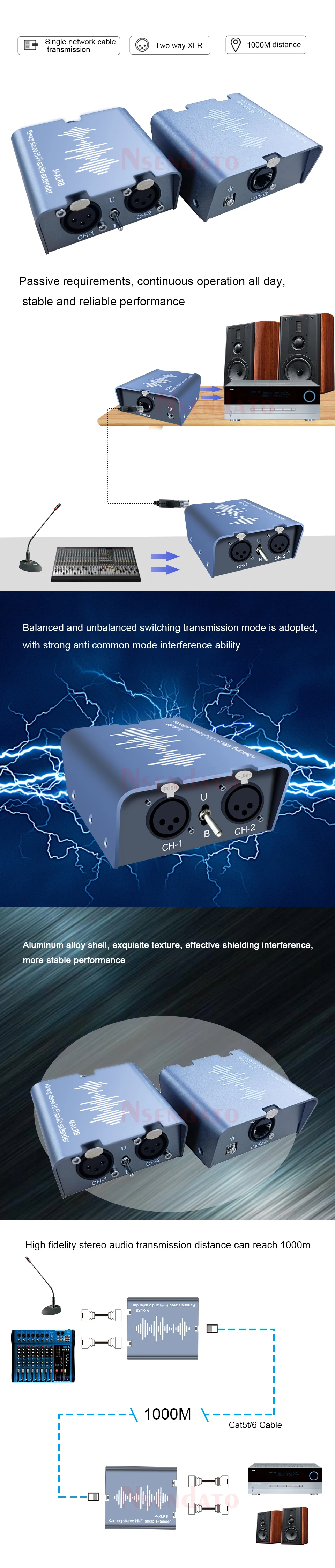 Introduction FeaturesDual XLR MIC audio twisted pair transmissionBalanced and unbalanced switching transmission mode is adopted, with strong resistance to common mode interferenceHigh fidelity stereo audio transmission distance can be up to 1000mSpecial audio spread spectrum isolation technology is adoptedBroadcast level hi-fi ground loop, ground loop audio isolationWorks continuously all day, stable and reliable performanceNo power requiredAudio matrix switcher, audio distributor for amplifier/booster/sound/microphone/home theater/DVD disc/video recorder/camera/mixer device/other commercial/consumer analog devicesSpecifications:High fidelity distribution display, digital set top boxHi-Fi for home theater, large screen projection video conferencePublic video broadcasting system,distance multimedia education,classroom medical treatmentMilitary field high fidelity flat panel video media advertising transmission demonstrationBandwidth:20Hz - 25 KHzInput signal peak:1.25Vp-pInput / output impedance:600 ohms MIN (signal source)insertion loss:<2dBSignal reflectivity:>15dBCommon mode rejection ratio:>60dBtransmission distance:1000mSignal result:Audio-Pins 1(R)&2(T),Pins 7(R)&8(T)Characteristic impedance:100 Ωdistributed capacitance:20 pf/ftattenuation:6.6 dB/305m @1 MHz