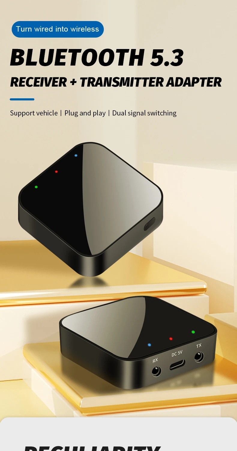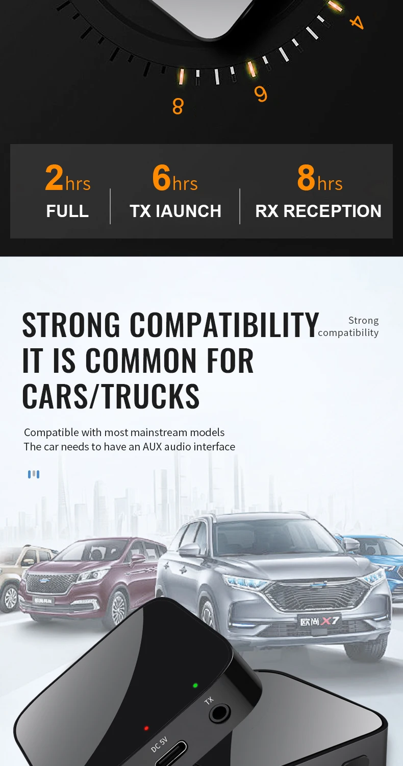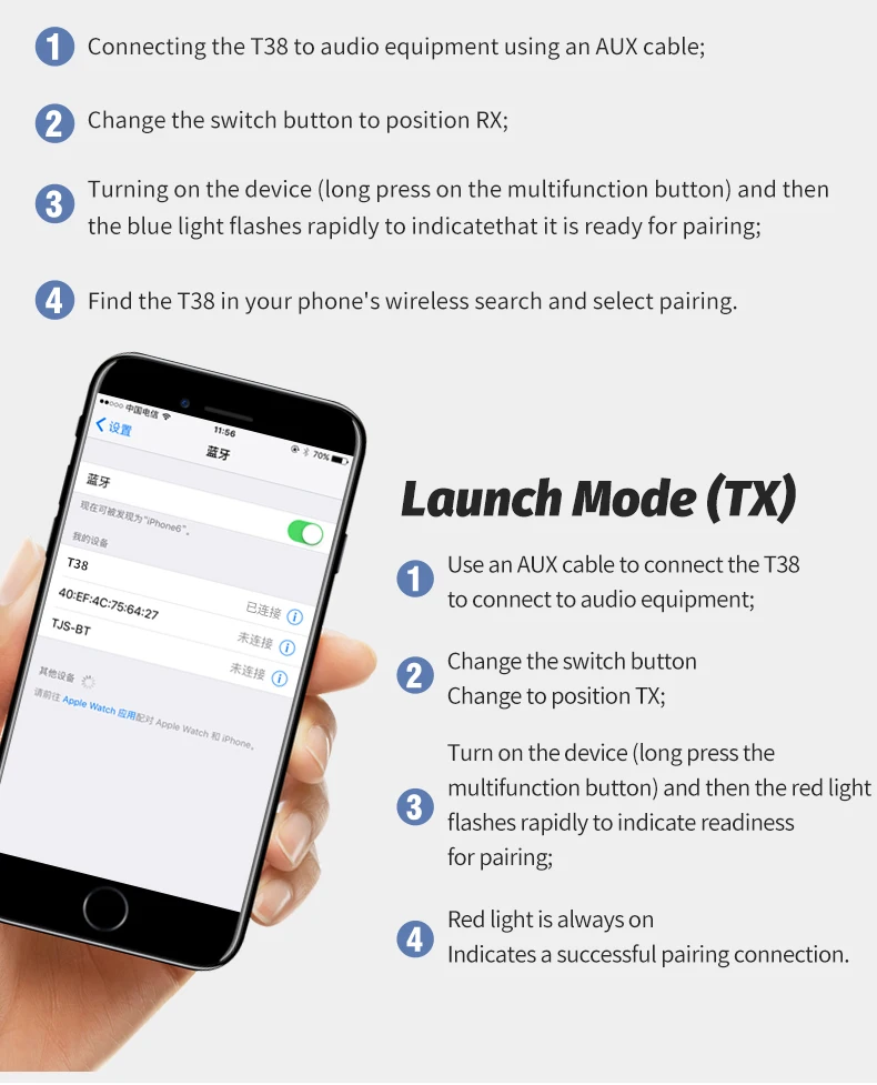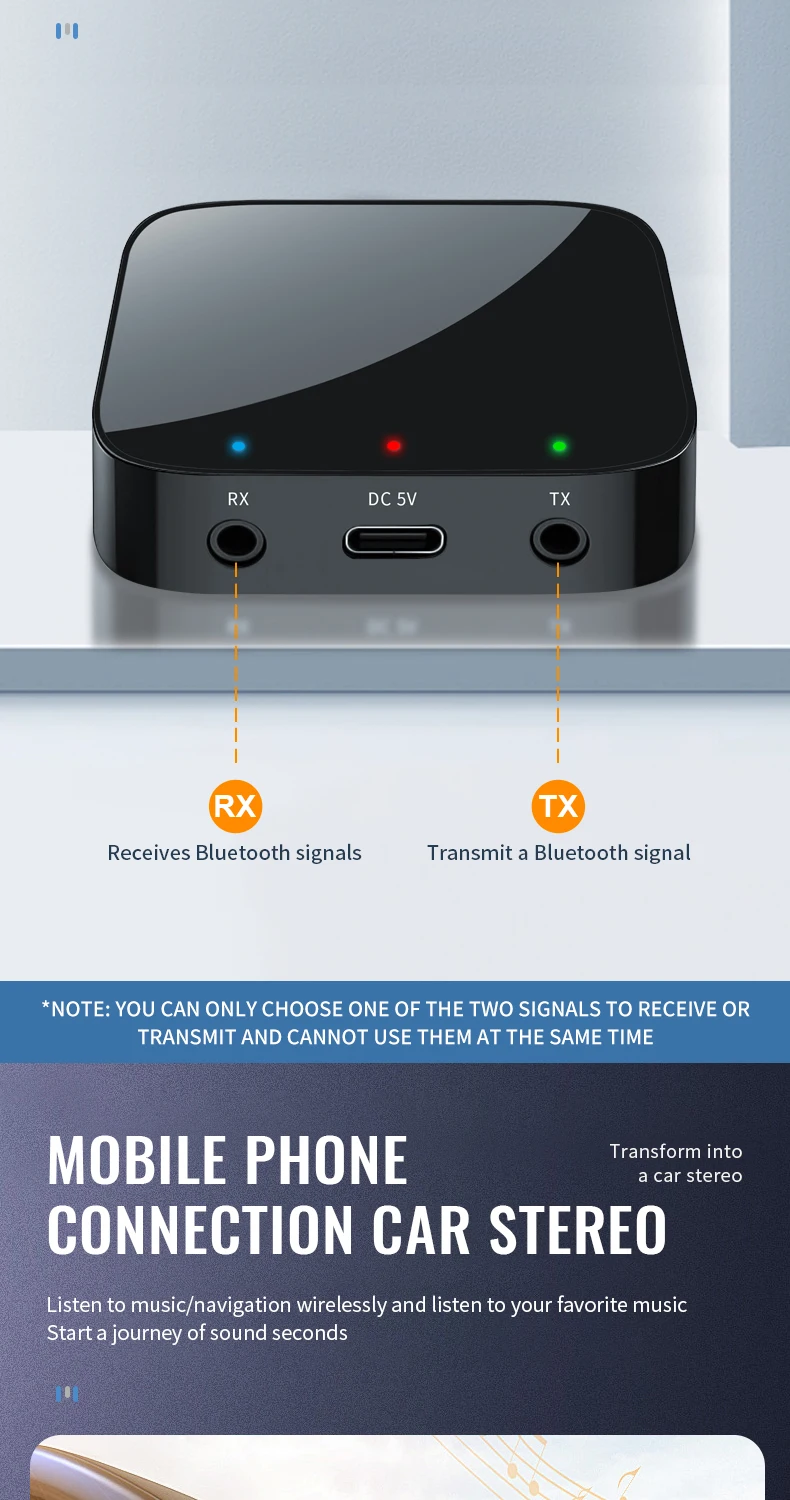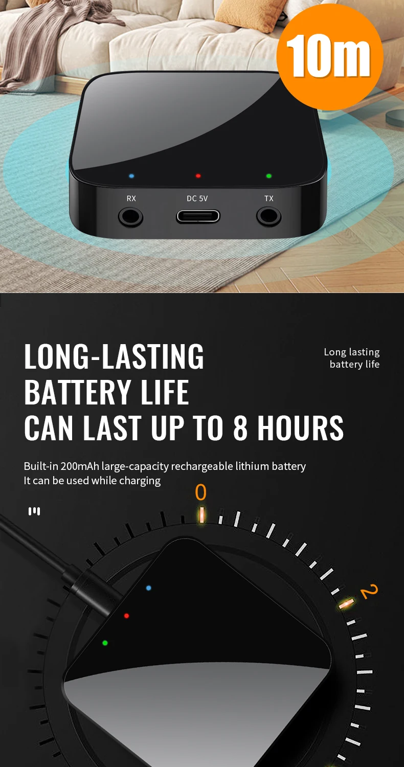 Este producto está configurado para recibir y transmitir, dispositivo Bluetooth dos en uno. Thisproduct es simple, que es capaz de lanzar y recibir toda la señal de audio libremente. A través del modo de recepción Bluetooth puede enviar la música del teléfono al equipo de audio doméstico tradicional, es más conveniente enviar TV, reproductor de CD, MP3 u otras fuentes al altavoz Bluetooth o auricular Bluetooth a través del modo de lanzamiento del producto Bluctooth. Debido a la tecnología de baja latencia del producto también es compatible con la transmisión de sonido en tiempo real de juegos en línea, televisión y películas. Este producto tiene una batería recargable incorporada, que tiene una batería de larga duración. Resuelve perfectamente las limitaciones de los equipos de audio y extiende una variedad de funciones de transferencia de equipos de audio.