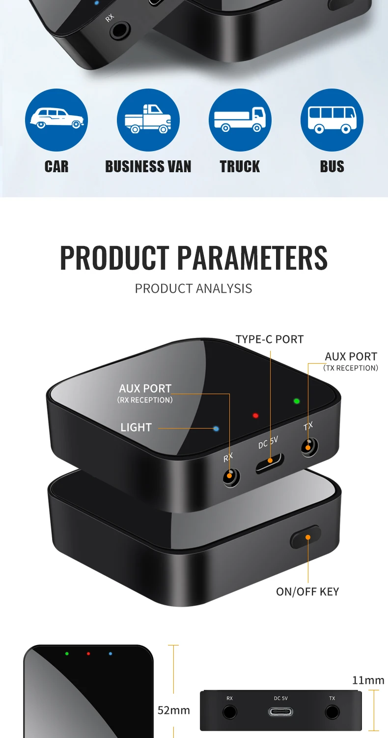 • Entrada de 3.5mm AUX :Con una entrada de 3.5mm AUX, este adaptador es compatible con la mayoría de los altavoces de coche, auriculares y televisores actuales.