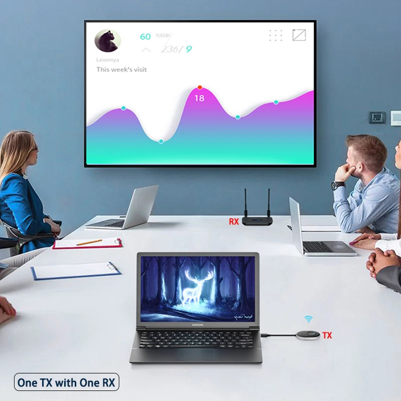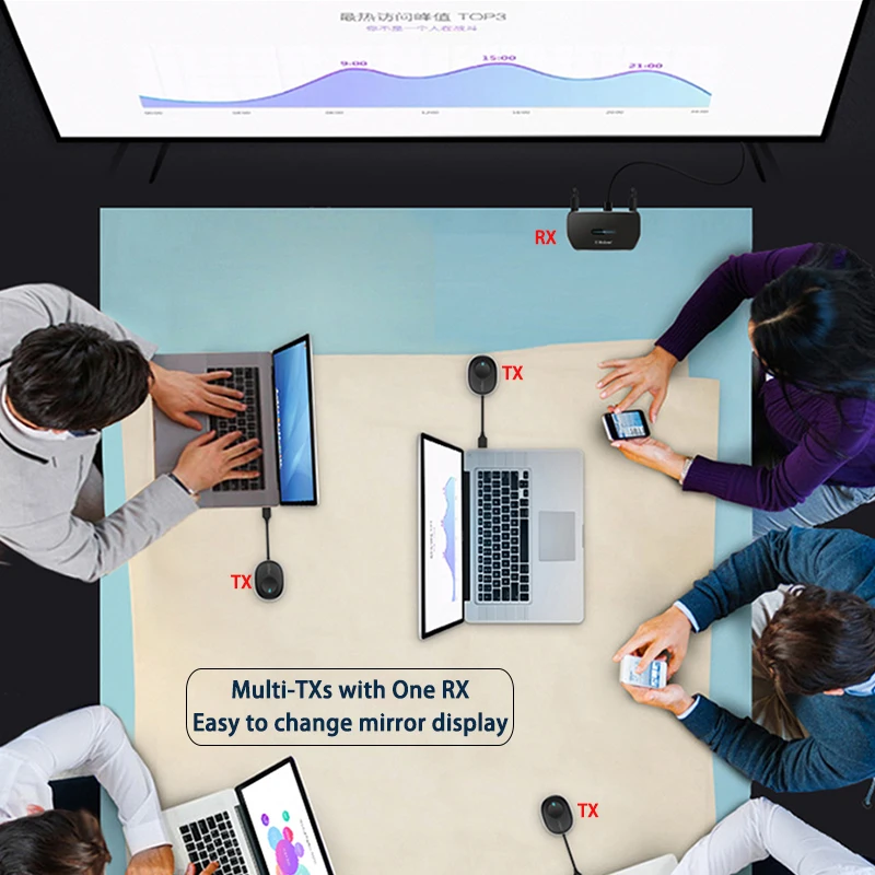 【 Muchos-a-uno Mode】 8 transmisores puede ser conectado a un receptor en el mismo tiempo uno haga clic en Cambiar ¿no interferir el uno con el otro y múltiples pantallas pueden ser compartido * NOTA: Esta operación requiere compra adicional de transmisores (TX) Y EL 1 receptores (RX) apoyo a 8 transmisores
