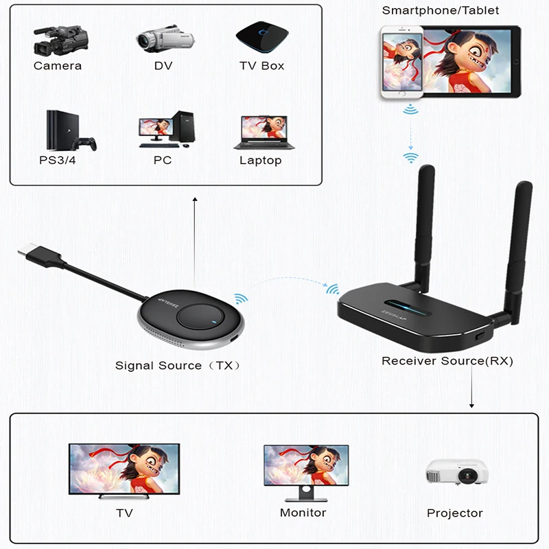 【No WiFi Required】Place una TV en cualquier lugar dentro de 50 metros de la fuente con incluyen receptor y transmisor Simplemente conecte el transmisor a un set top caja de juego de consola ¡U otro dispositivo de salida HDMI y conecte el receptor a cualquier pantalla HD!