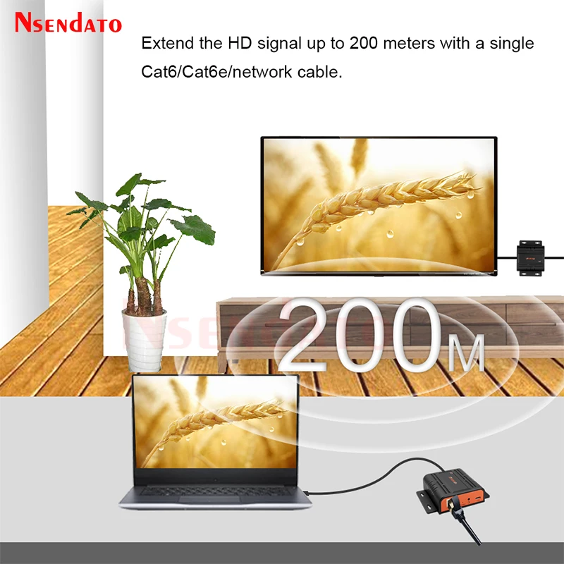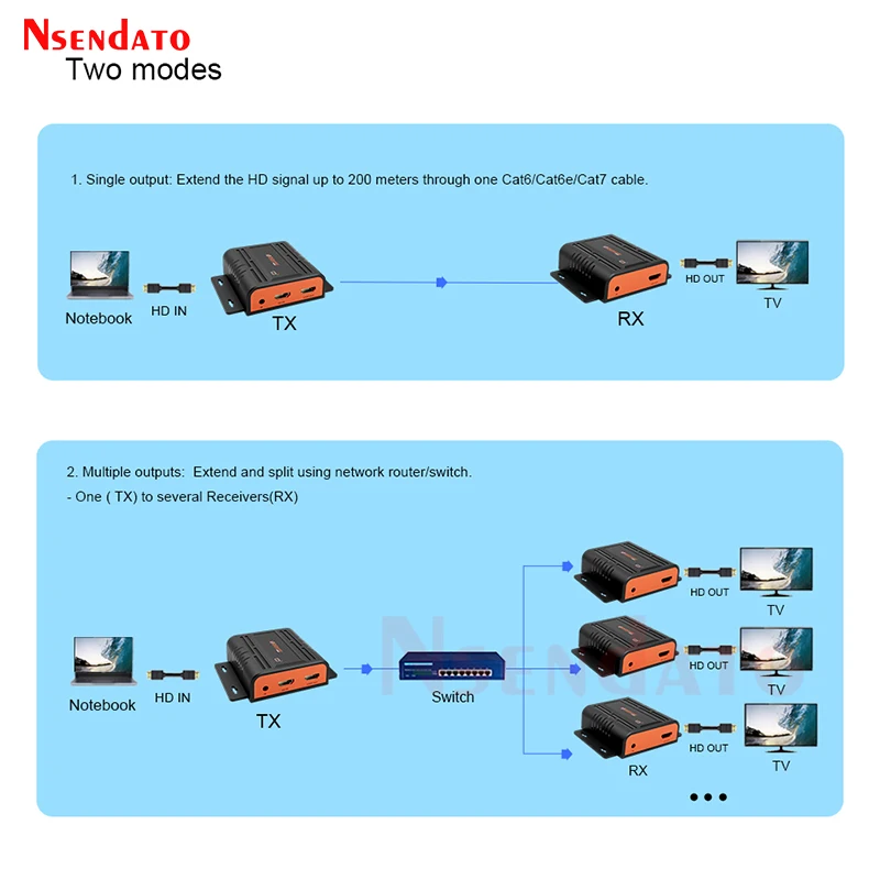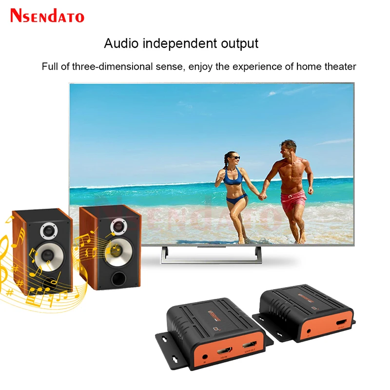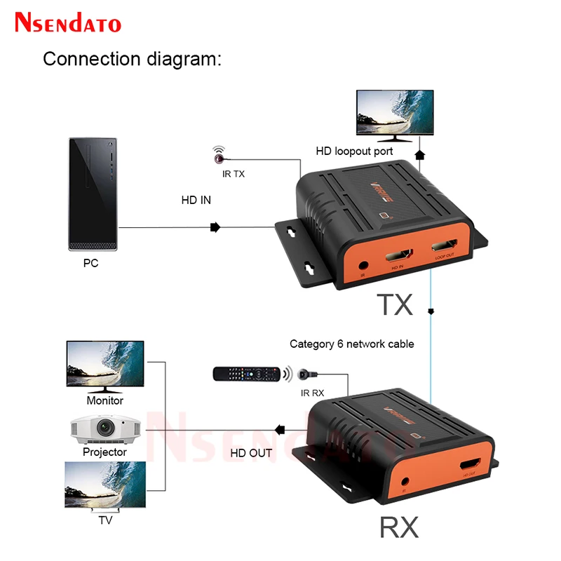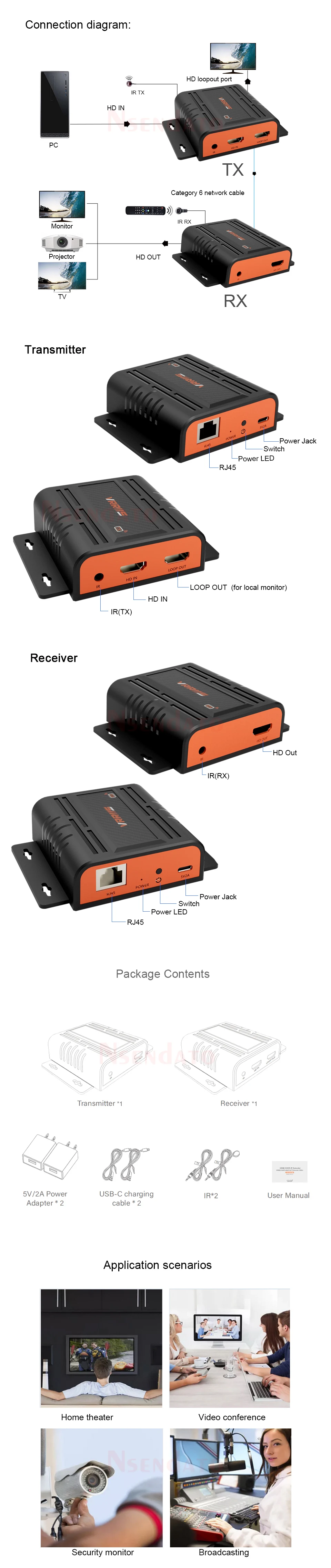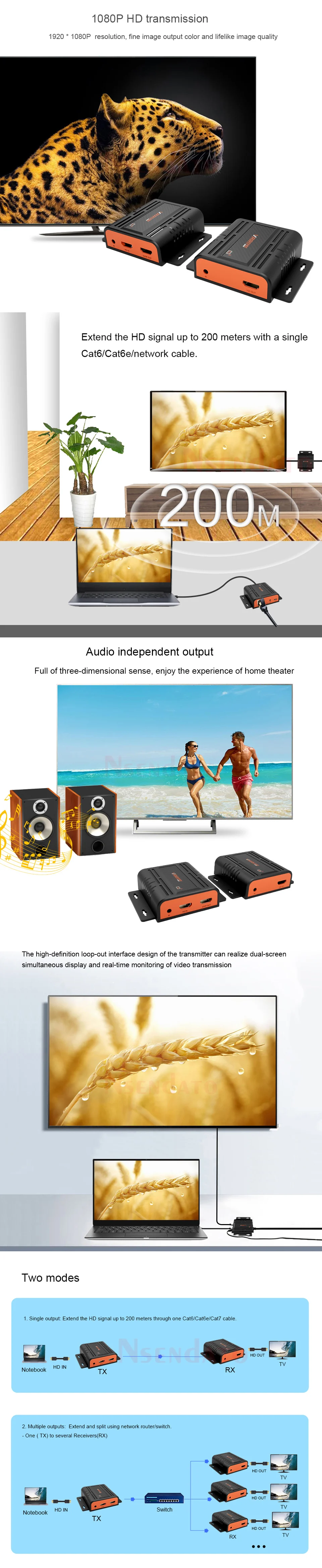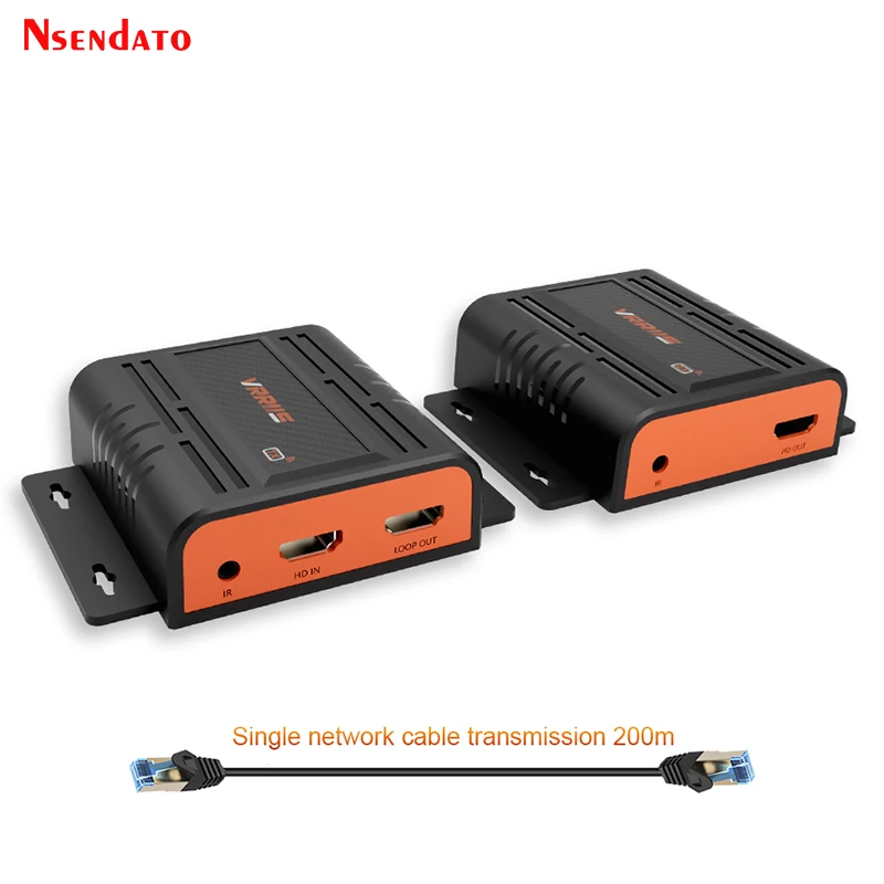 Transmisor y receptor de vídeo Compatible con HDMI 1080P 200M RJ45 extensor divisor Multi HD sobre Ethernet IP para cámara STB DVD PCIntroducciónEl extensor Compatible con HDMI transmite señales de audio HD a través del cable de red. Al mismo tiempo, admite la función de control remoto por infrarrojos. El dispositivo tiene excelentes capacidades de procesamiento y transmisión de imágenes y hace que la transmisión de señal sea más suave y estable. Es un dispositivo de transmisión de señal HD rentableCaracterísticasTransmite señal HD, la distancia de transmisión puede ser de hasta 200m aproximadamente, si un interruptor está configurado, la distancia puede ser de hasta 350m aproximadamente.Transmisión a larga distancia, calidad de imagen sin pérdidas, sin entorno de retraso sin interferencias, admite control remoto para controlar la fuente de vídeo.No hay límite en el número de receptores, incluso 10000 RXS también pueden funcionar fácilmente porque estamos sobre IP.Fácil de instalar, plug and play sin necesidad de configurarPasos de instalación1. Encienda RX y TX con adaptador de corriente de 5V2A.2. Conecte "HD IN" de TX con la fuente de señal por cable HD, monitor local (si lo tiene) Conecte "LOOP OUT" de TX por cable HD3. Conecte "HD OUT" de RX con el objetivo por cable HD4. Presione el interruptor de alimentación de TX & RX, el LED "power" que muestra "rojo" significa que está listo.5 conecta el TX "RJ45" con RX "RJ45" por CAT6/ CAT6E/ CAT7, cuando cada LED naranja "RJ45" siga funcionando y el LED verde siga parpadeando,. Indica que la conexión se ha realizado correctamente.Las especificacionesSeñal de salida: M-JPEGProtocolo: M-JPEGResolución: hasta 1080pDistancia de transmisión: hasta 200m(656ft)Cable de red: Cat6/Cat6e/Cat7Cable HD: hasta 2m (entrada y salida)Fuente de alimentación: DC5V/2ALista del paquete (conjunto completo)TransmisorReceptorUSB-C CableCable IRAdaptador de CCManual