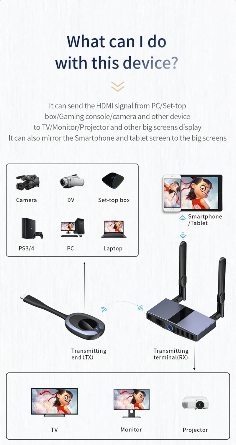 Con este producto, puede disfrutar fácilmente de una pantalla grande, entre TX (conéctese a TV Box/DVD/Cámara/