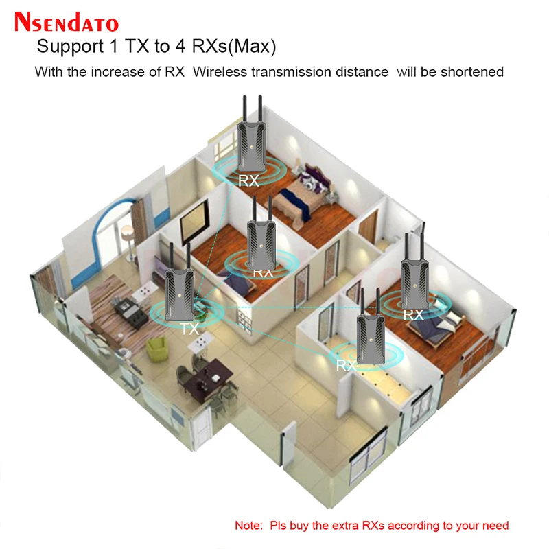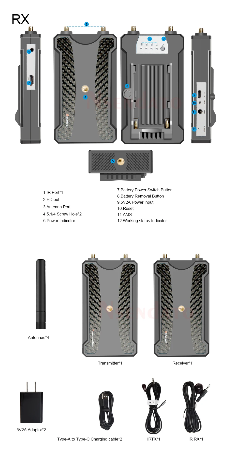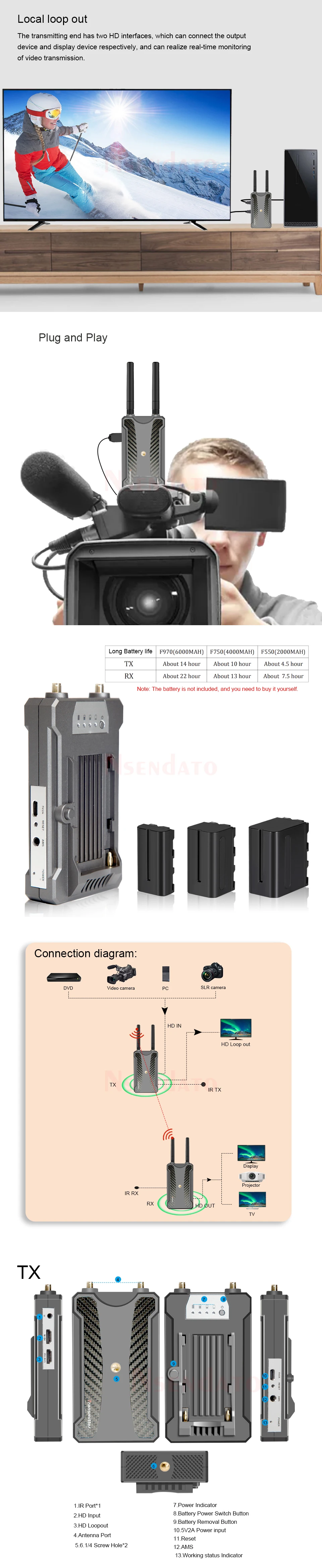 RX alrededor de 22 horas alrededor de 13 horas alrededor de 7,5 horas2, antena, Tenemos dos versiones de antena, rango de trabajo de antena larga de hasta 200m, Antena pequeña de hasta 230MCaracterísticas:1. Diseñado con compartimento de la batería, la fuente de alimentación es más conveniente.2. Dos botones en la parte posterior para un fácil control de la potencia de la batería y la eliminación de la batería, cuatro indicadores de nivel de batería.3. Distancia de transmisión de uno a uno de hasta 200m (en un entorno sin barrera de línea recta).4. La latencia Ultra baja es de aproximadamente 0,1 s, puede ignorar.5. El transmisor está diseñado con una salida local compatible con HDMI.6. Admite múltiples modos de alimentación7. Un transmisor puede trabajar con hasta cuatro receptores al mismo tiempo.8. Protocolo de transmisión inalámbrica integrado, No se requiere WiFi/red ni aplicaciones;.9.Plug and Play: Hemos emparejado bien al enviar, lo obtienes, plug and play.10. Admite entrada de micrófono y separación de audio.11. Altamente Compatible: totalmente compatible con HDMI de 1080P para host de juegos/DVD/decodificador/PS3/4/5/Xbox/ordenador/cámara HD, monitor de vídeo y dispositivos de fuente etc./TV/Proyectores compatibles con HDMI.12 Cuando uno a un modo, puede pasar por una pared/puerta o techo. Capacidad de transmisión muy fuerteNOTA DE LOS Pls:1. El RX no puede funcionar solo, un TX puede combinar hasta 4 RXs.Esta operación requiere la compra adicional de los receptores; RX=receptor, TX=transmisor.2. Cable Compatible con HDMI, la batería no está incluida3. Con el aumento de RX o las barreras, la distancia de transmisión inalámbrica se acortará.Tales como:Distancia de transmisión de 1 TX a 1 RX: máx. 200m;Distancia de transmisión de 1 a 2 TX RX: máx. 60m;Distancia de transmisión de 1 a 3 TX RX: máx. 30m;Distancia de transmisión de 1 a 4 TX RX: máx. 20m;4. La función IR solo funciona en un modo TX a un modo RX.Contenido del paquete para la opción de "RX":Receptor inalámbrico de 200m x 1Antena x 2Adaptador de corriente DC 5V 2A x 1Cable de alimentación USB x1IR cable x 1Guía del usuario 1x1Nota: Si eliges esta opción, vienen los accesorios solo para 1 receptor, sin transmisorContenido del paquete para la opción de "1 TX y 1 RX":1 transmisor inalámbrico de 200mReceptor inalámbrico de 200m x 1Antena 4x4Adaptador de corriente de 5V 2A x 2Cable de alimentación USB x2Cable IR x 2Comprar Transmisor y receptor de vídeo inalámbrico Compatible con HDMI, Wifi, 200m, extensor, pasa por la pared, para PS4, TV Box, cámara DSLR, proyector para PC