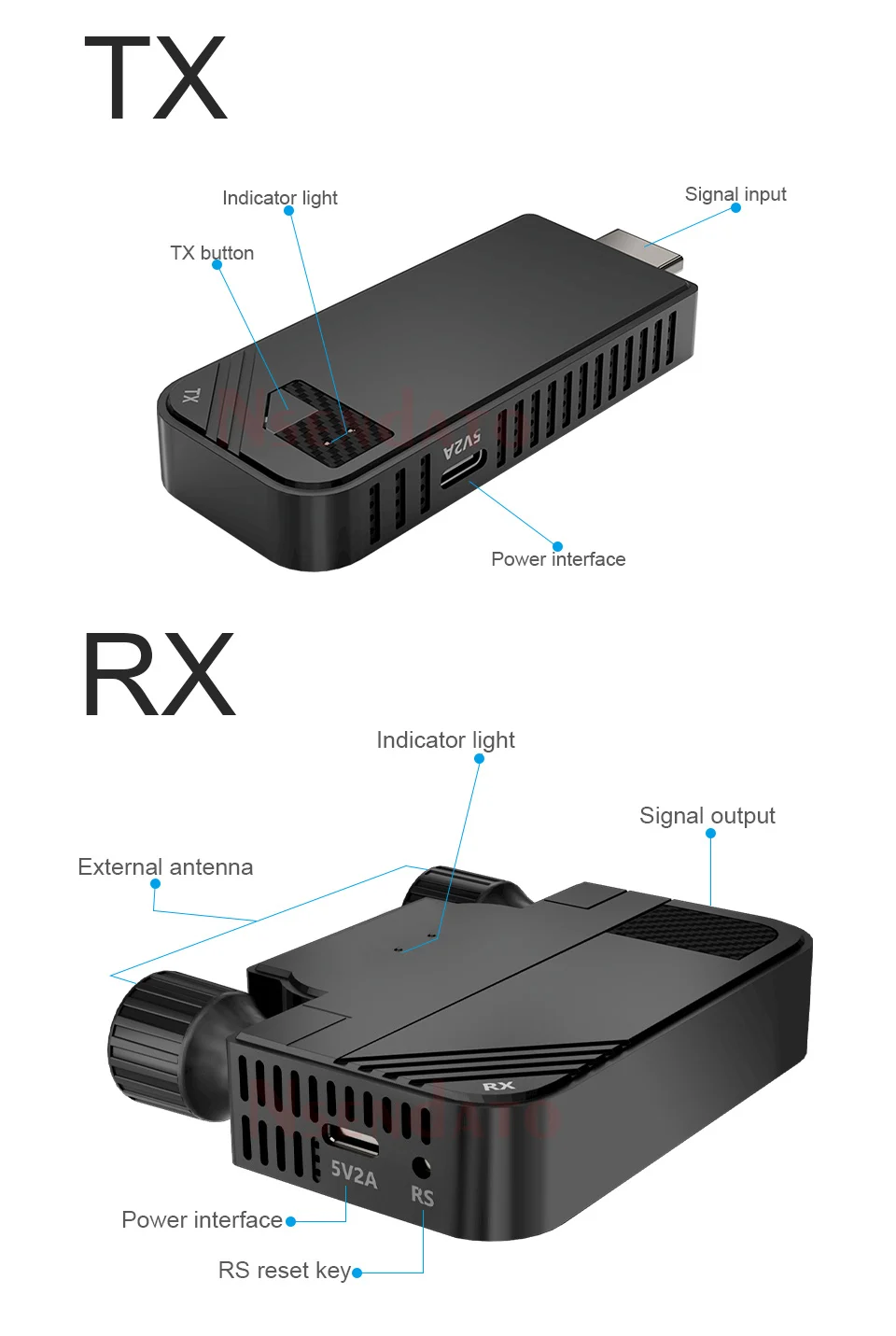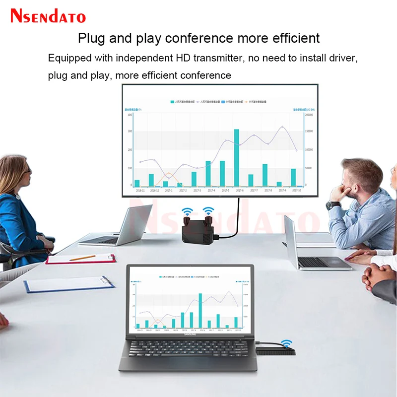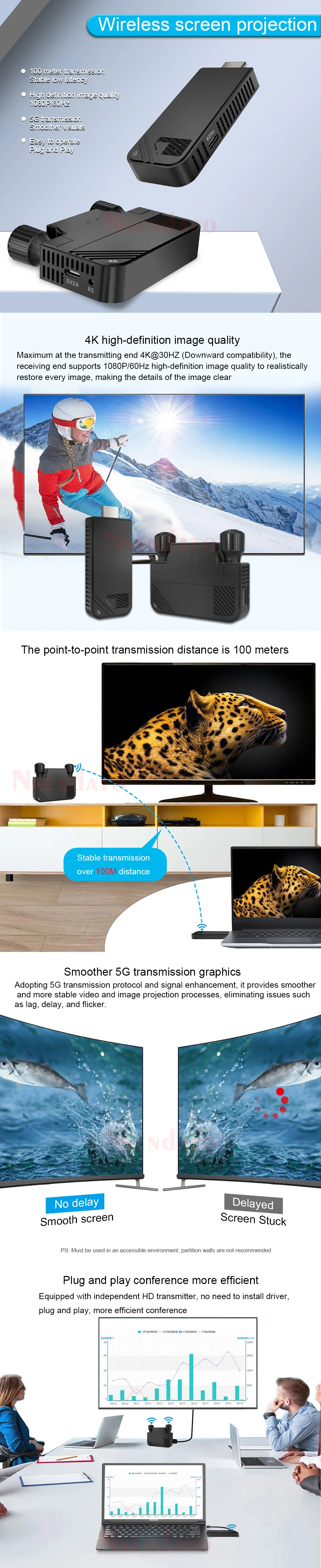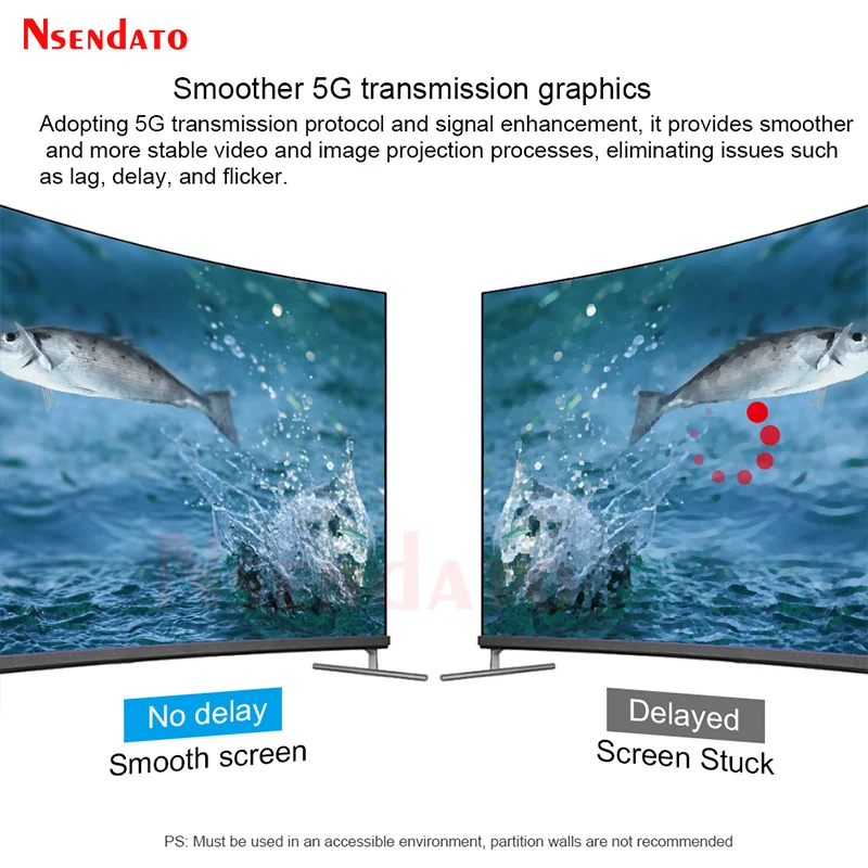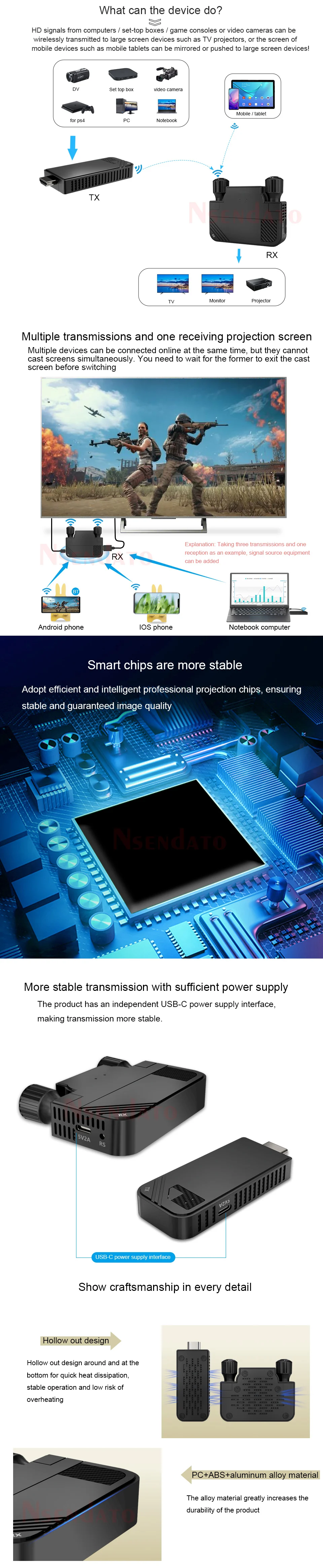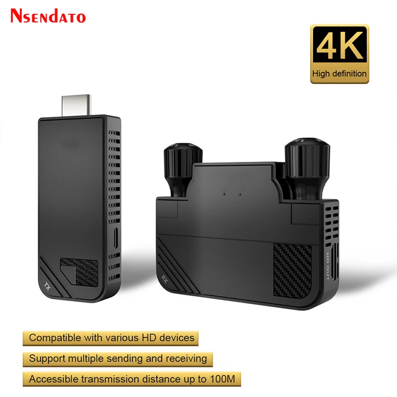 Nota:1. La descripción para el conjunto completo, pero tenemos tres opciones, una es solo para el transmisor, una es solo para el receptor, la otra es un conjunto completo con RX (receptor) TX (transmisor), ¡para que pueda seleccionar lo que desee!2, modelo El tiene dos versiones, versión HD con puerto compatible con HDMI, versión tipo C con puerto tipo C, así que seleccione el tipo necesario.3. La HDMI descripción con la versión compatible con, por favor contáctenos si necesita más información sobre la versión normalDescripción:El transmisor y receptor inalámbrico compatible con HDMI Nsendato puede extender la distancia de transmisión inalámbrica entre el dispositivo fuente compatible con HDMI y el dispositivo de visualización compatible con HDMI hasta 330 pies. El producto contiene un transmisor y un receptor, simplemente conecte fácilmente TX y RX de forma inalámbrica para presentar una calidad de imagen clara. La nueva tecnología mejorada reduce en gran medida la interferencia de la señal WiFi, lo que puede mejorar la calidad y la estabilidad de la transmisión de la señal, y ayudar a expandir la aplicación de dispositivos electrónicos HD AV en más escenarios; también puede usar el receptor solo para emparejar con más productos inalámbricos como ordenadores portátiles, teléfonos móviles, tabletas, etc.Para fundición de pantalla.* La distancia de extensión depende del entorno específico: reforzadoEl hormigón, los ladrillos sólidos, el vidrio, los paneles de madera, etc. pueden acortar elDistancia de extensión.Características1. Distancia de transmisión sin obstáculos entre el transmisor y el receptor de hasta 330 pies.2.Compatible con varios dispositivos compatibles con HDMI, amplia gama de escenarios de aplicación.3. Admite resolución full HD 1920*1080P con señal estable y sin latencia.4.Plug and Play: el transmisor y el receptor están emparejados de fábrica, no se requiere la instalación de software o controlador.5. Muchos a uno: admite múltiples dispositivos conectados a un receptor en línea al mismo tiempo para compartir múltiples recursos.Especificación:Protocolos de soporte:; HDCP-compatible1.4Resolución máxima: 1920 × 1080P @ 60HzHD IN: Máximo 4K @ 30HZ (retrocompatible)Salida HD: 1080P a 60HzLatencia de transmisión: 0,06 SSoporte de características: Compatibe-EZCast, EZAir (espejo de pantalla iOS),DLNA,Miracast.Sistemas compatibles: Para Android/ iOS/Windows/MacOSEstándares inalámbricos: 803.11a/nFrecuencia: 5GHzTipo de interfaz de fuente de alimentación:Distancia de transmisión: TX a RX hasta 330 pies, e igual para el teléfono móvil IOS; Transmisión de pantalla inalámbrica paraDistancia de la computadora Windows hasta 132FT; La pantalla inalámbrica a través de la distancia de la pared puede alcanzar 60 FTEscenarios aplicables: Conferencia, hogar, conferencia, PS4Paquete (juego completo):Transmisor (TX)Receptor (RX)Adaptador de corrienteCable compatible con HDMICable de carga,