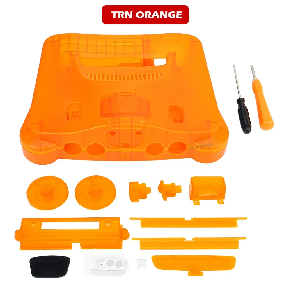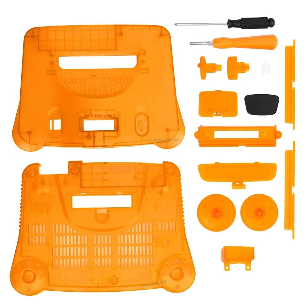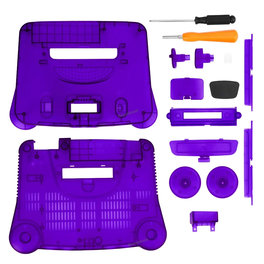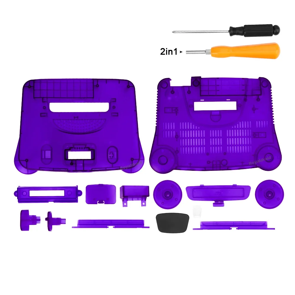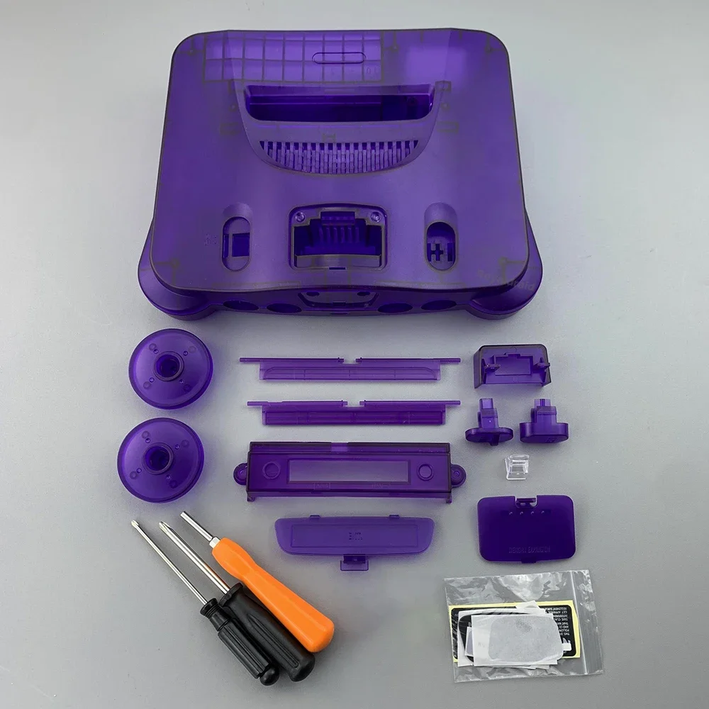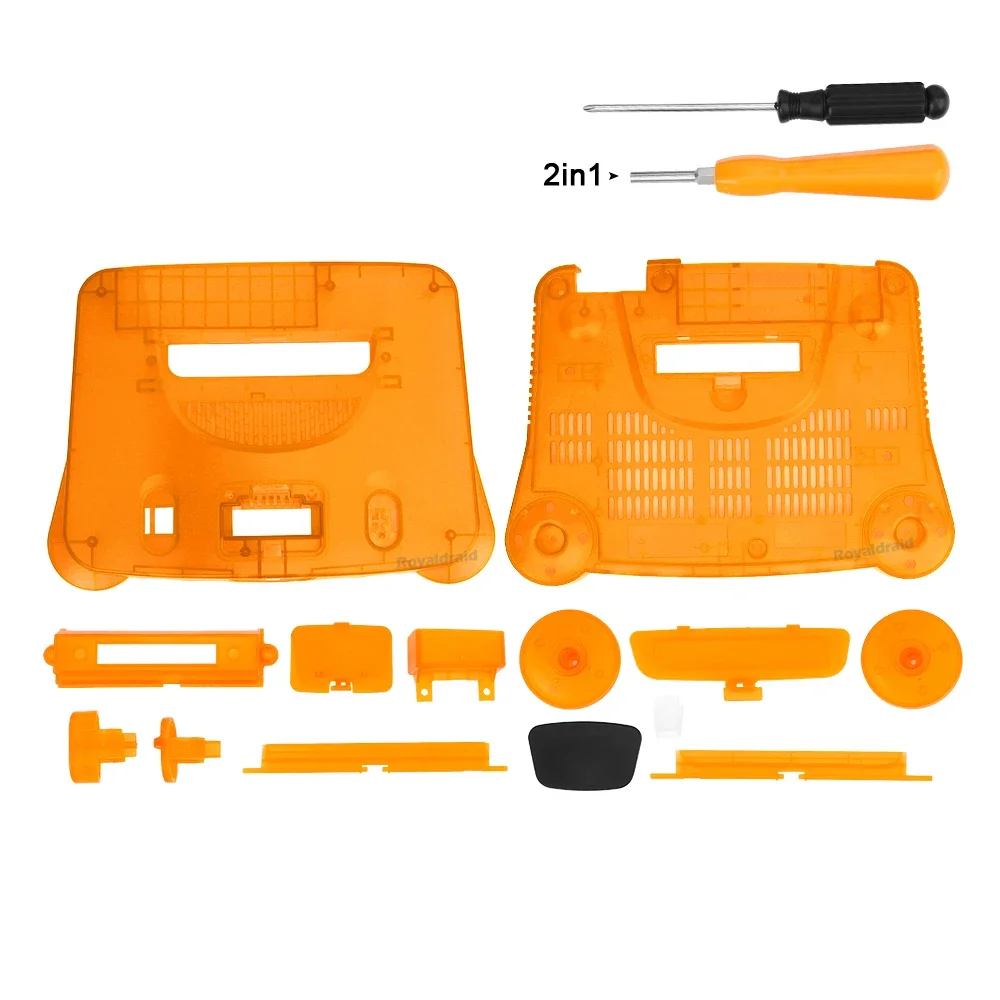 Estuche translúcido incluido botón superior, inferior, encendido y reinicioAdecuado para cualquier región para la consola N64.Viene con herramienta de destornillador de instalación y pegatina.