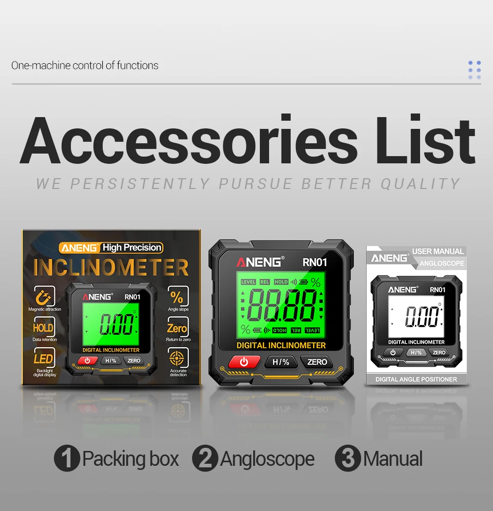 El paquete incluye: Inclinómetro digital × 1, Instrucción × 1, Caja de paquete × 1