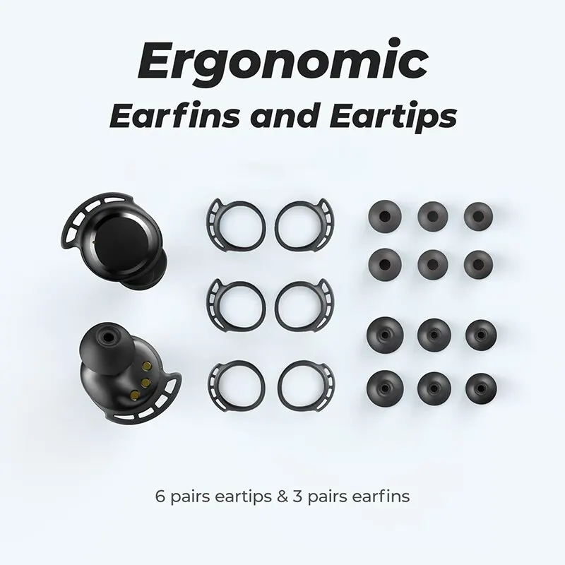 Tres pares de tapas de silicona con punta de Bala (L/M/S) para una experiencia auditiva más equilibrada, mientras que los tres pares de auriculares de doble brida (L/M/S) traen una mejor reducción de ruido pasiva y sonido rico.