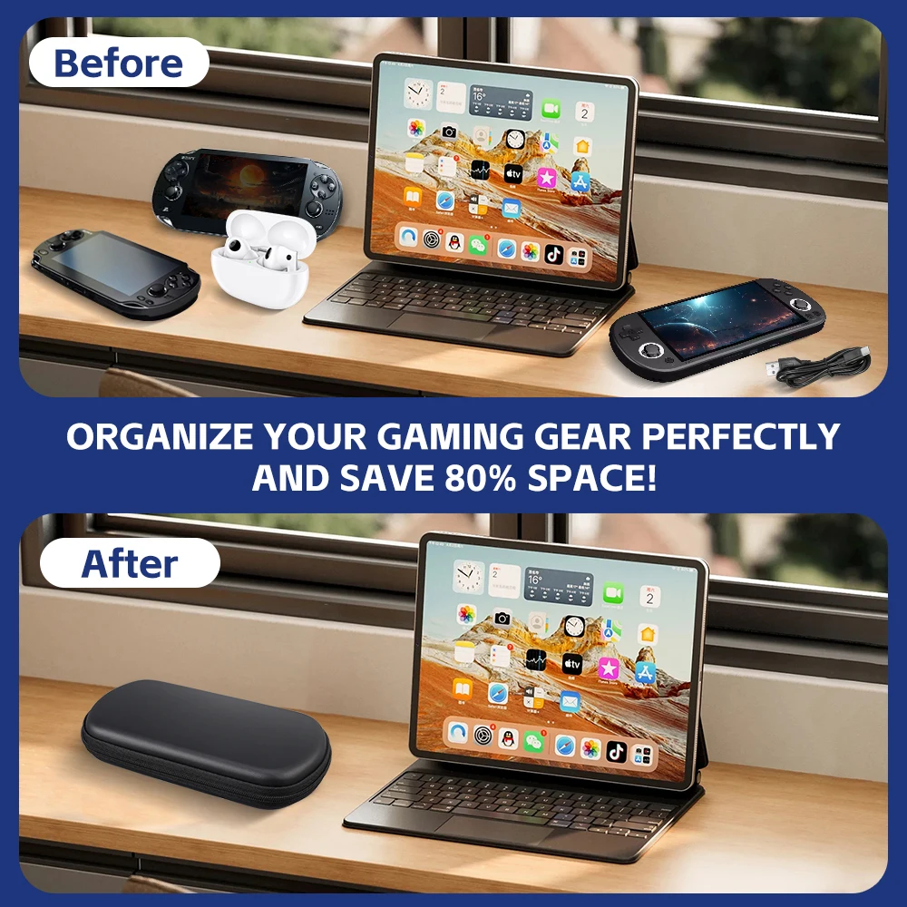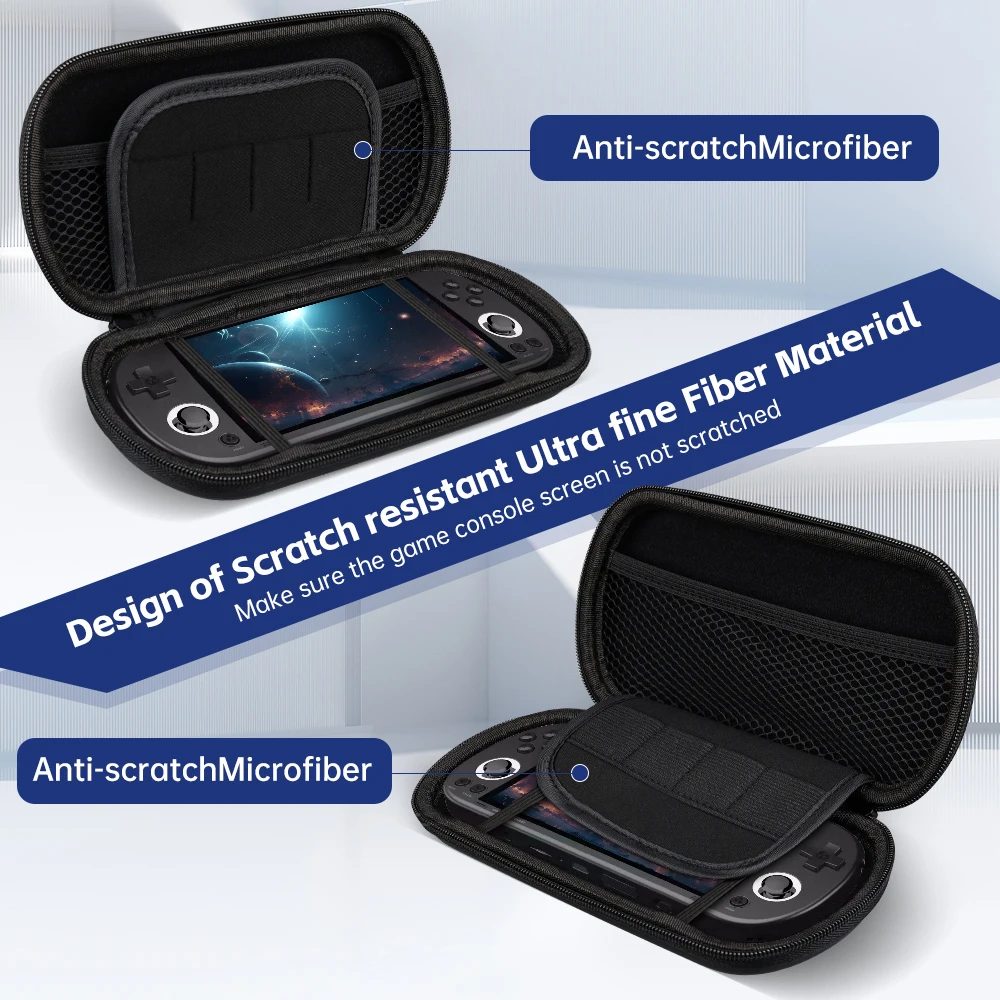 El interior de la carcasa dura cuenta con una ranura dedicada para almacenar la consola de juegos, diseñada para adaptarse perfectamente. El bolsillo de malla con cremallera adicional puede contener accesorios como cables de datos, cargadores, tarjetas SD, manteniendo todos sus pequeños accesorios organizados.