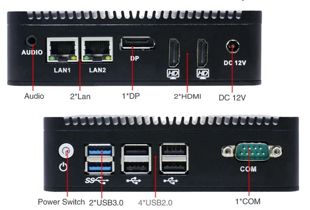 2 *, 1 * ENTRADA DE CC de 12V, 1 * DP,2 * HDMI,2 * USB3.0,2 * USB2.0,1 * interruptor de alimentación, 2 * RS232 COM,1 * Audio