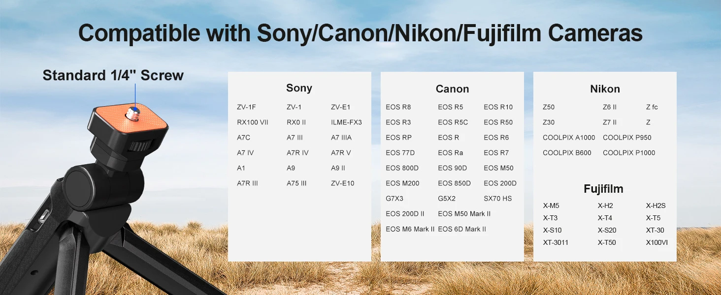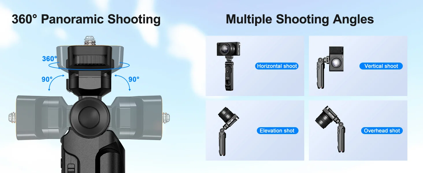 Cambie instantáneamente entre los modos portátil y trípode.180° inclinación + 360° La sartén ofrece tomas verticales, horizontales, de ángulo bajo o superiores.El tornillo estándar de 1/4 de pulgada se adapta a la mayoría de las cámaras.
