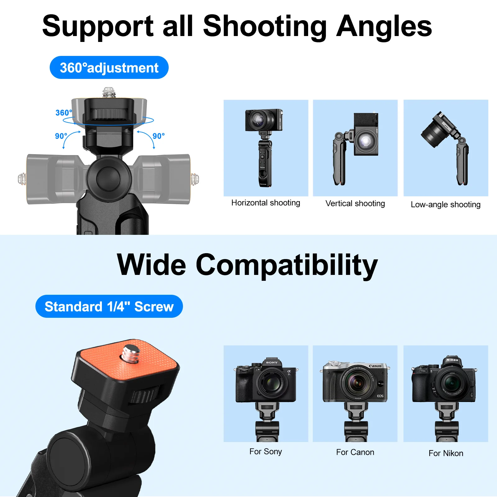 Cambie instantáneamente entre los modos portátil y trípode.180° inclinación + 360° La sartén ofrece tomas verticales, horizontales, de ángulo bajo o superiores.El tornillo estándar de 1/4 de pulgada se adapta a la mayoría de las cámaras.