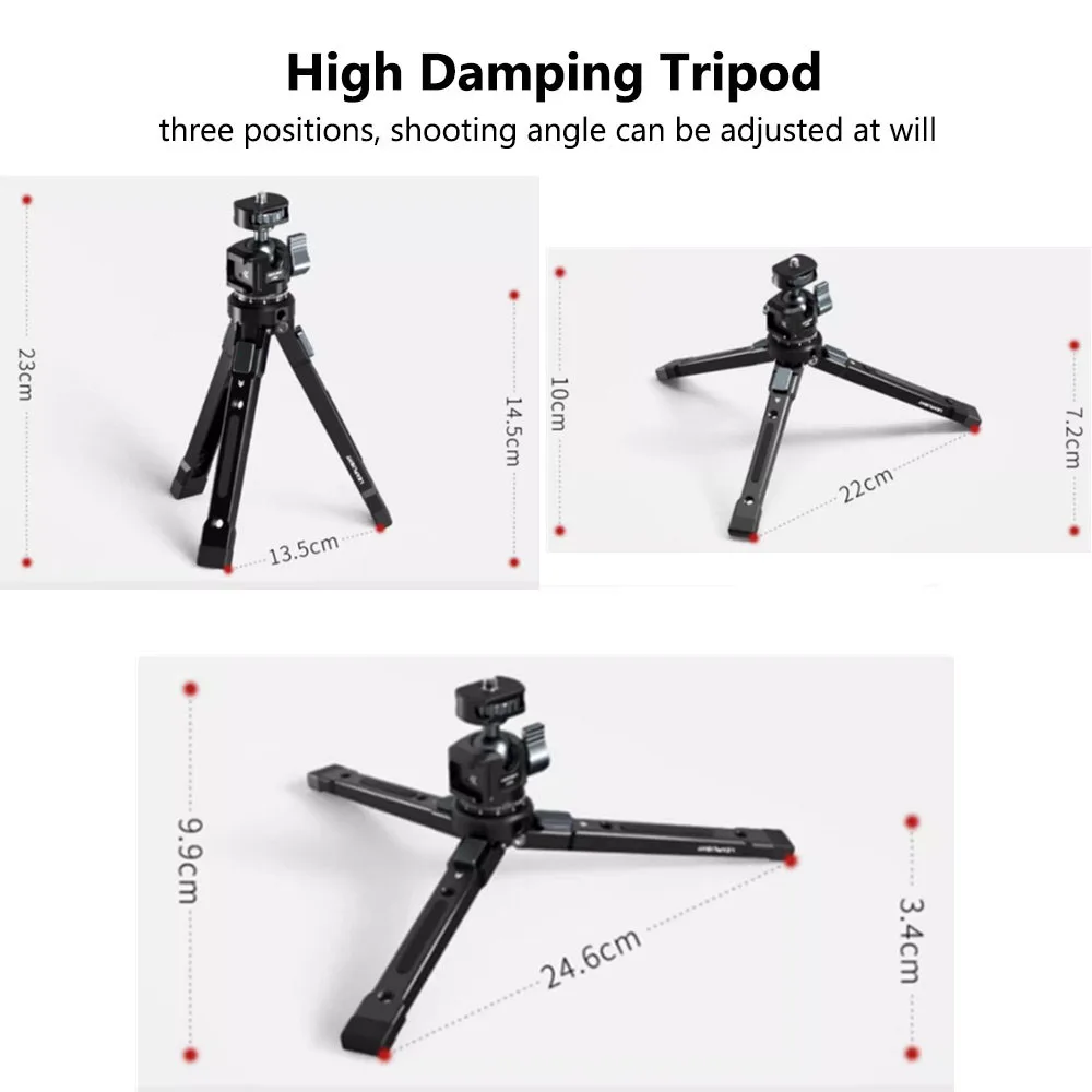 Lleva tus habilidades de fotografía y vídeo al siguiente nivel con nuestro mini trípode. Con una construcción de aleación de aluminio resistente y una carga máxima de 8kg/lb 17,63, este trípode portátil es perfecto para cardanes, cámaras DSLR y videocámaras. No se pierda un momento: Capture cada aventura con facilidad y confianza.