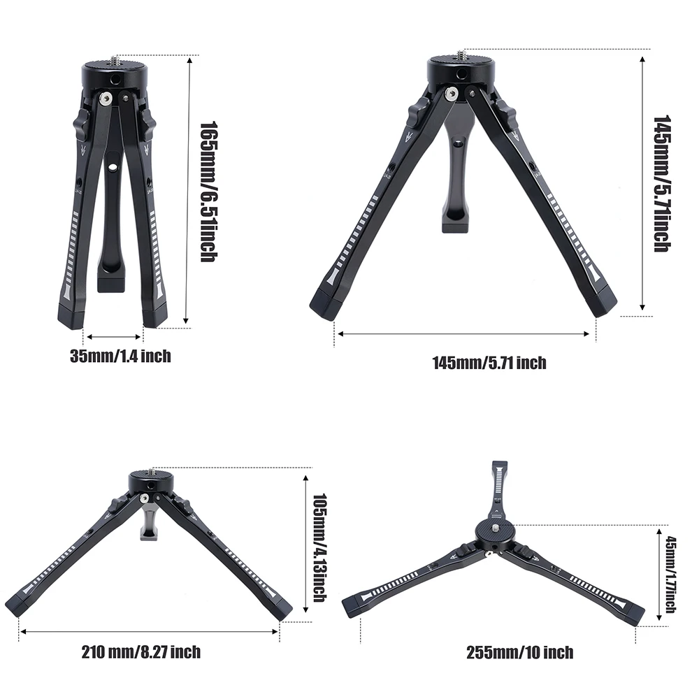 El diseño de posicionamiento de 3 ángulos garantiza disparos de manera estable incluso en terrenos estrechos o en terrenos irregulares;El trípode es liviano y compacto, con altura ajustable de 45 mm a 165 mm, perfecto para viajes, aventuras al aire libre o actividades en interiores, cómodo de llevar.