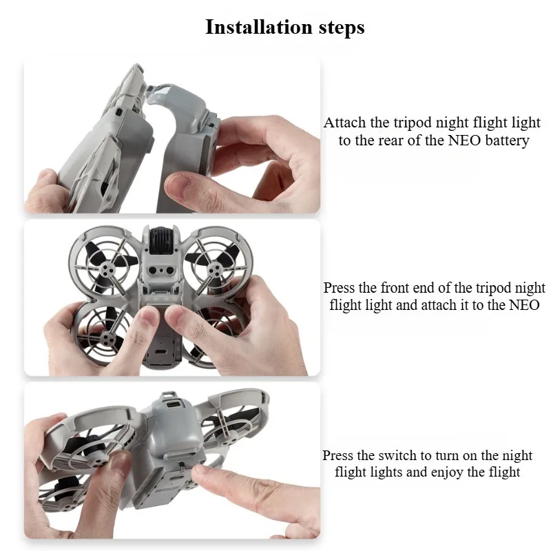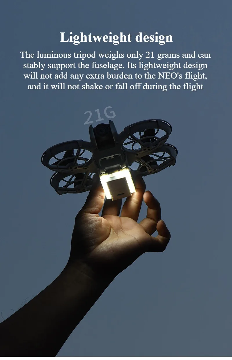 1."1.La luz nocturna con trípode está diseñada para drones DJI NEO.El ajuste perfecto para el cuerpo curvo de DJI NEO le permite observar mejor su entorno cuando vuela, se despega o aterriza en las noches oscuras.