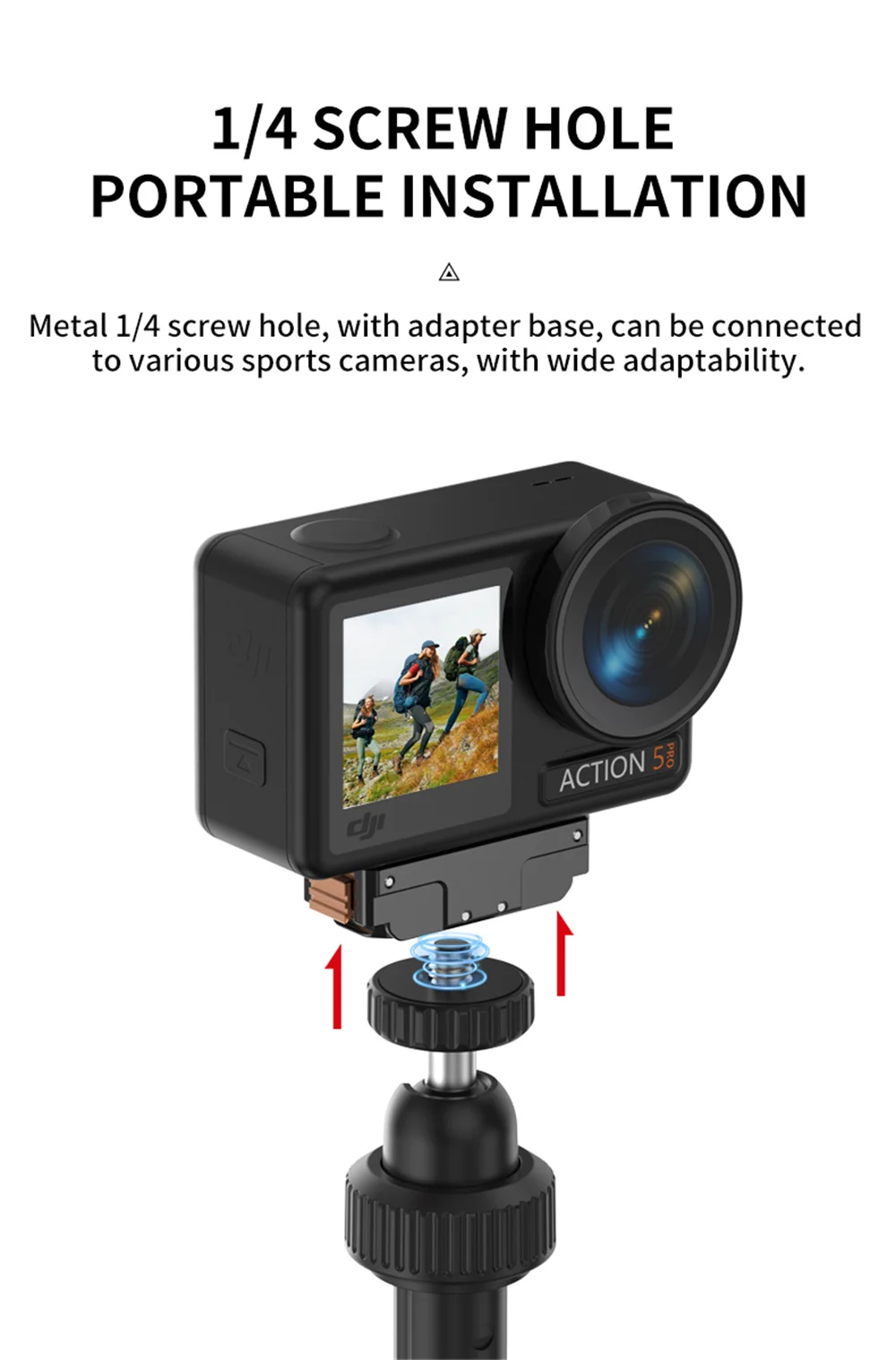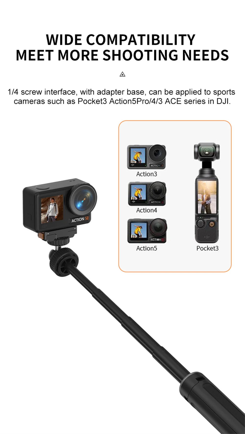 Este trípode está equipado con un orificio para tornillo de 1/4", lo que le permite ser compatible con una variedad de cámaras deportivas, incluidas las series Pocket3, Action 5, Pro/4/3 y ACE de DJI, lo que garantiza que pueda usarlo con su equipo favorito - 360° Cabezal de bola de rotación