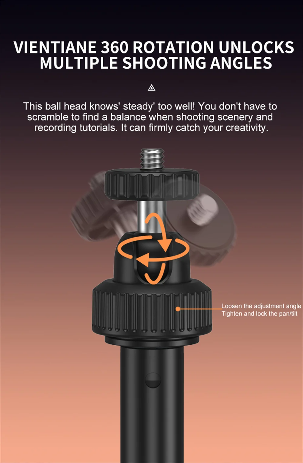 Experimente la libertad de disparar en múltiples ángulos con el 360° rótula de rotación y altura de cinco segmentos.